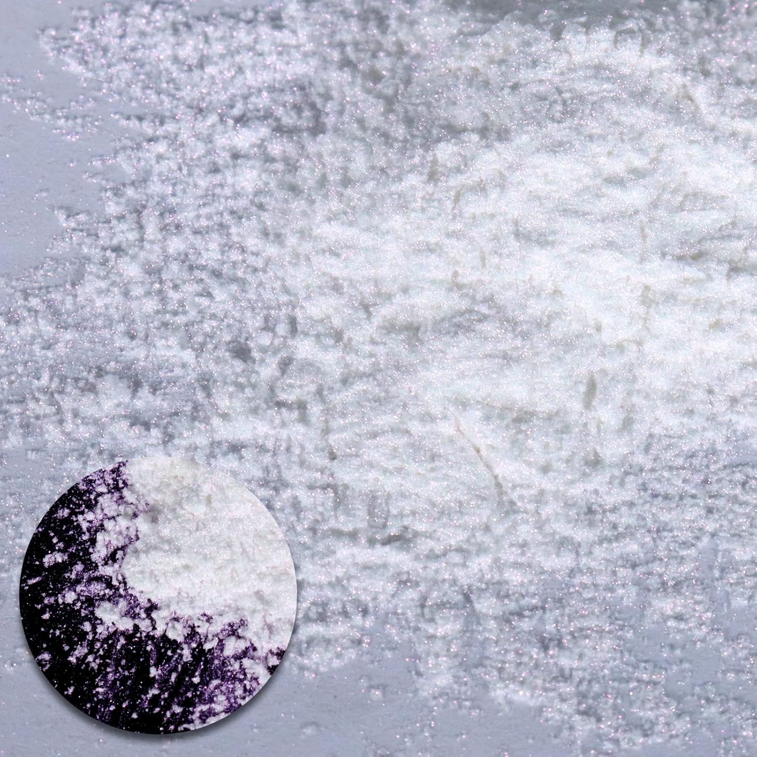 - ✨ Chameleon Mica Powder: Appearance is white mica powder defined by light refraction, reflection, and transmission to show color. A sparkly white color pigment that has Purple-Green-Rose Red hues when mixed into clear epoxy resin. These micas will elevate your resin projects in a subtle color shift all while remaining pearlescent.