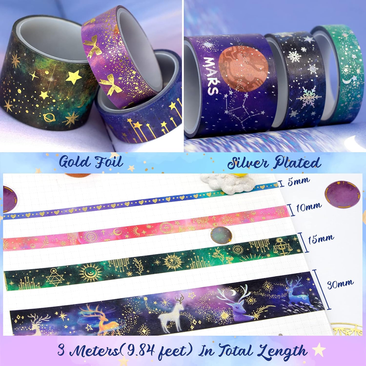 - Gold & Silver Plated - Galaxy washi tapes with unique gold foil and silver glitter, we use exquisite process printing. Colorful galaxy washy tape looks mysterious and dreamy, which has the constellation, celestial, sun, stars, planets, meteors, nebulae, hearts, bows, moons and other fantastic and starry sky series pattern in the galaxy. The starry sky is a symbol of eternity and the starry sky represents good luck. This washy-tape will let you explore the endless universe and the unknown