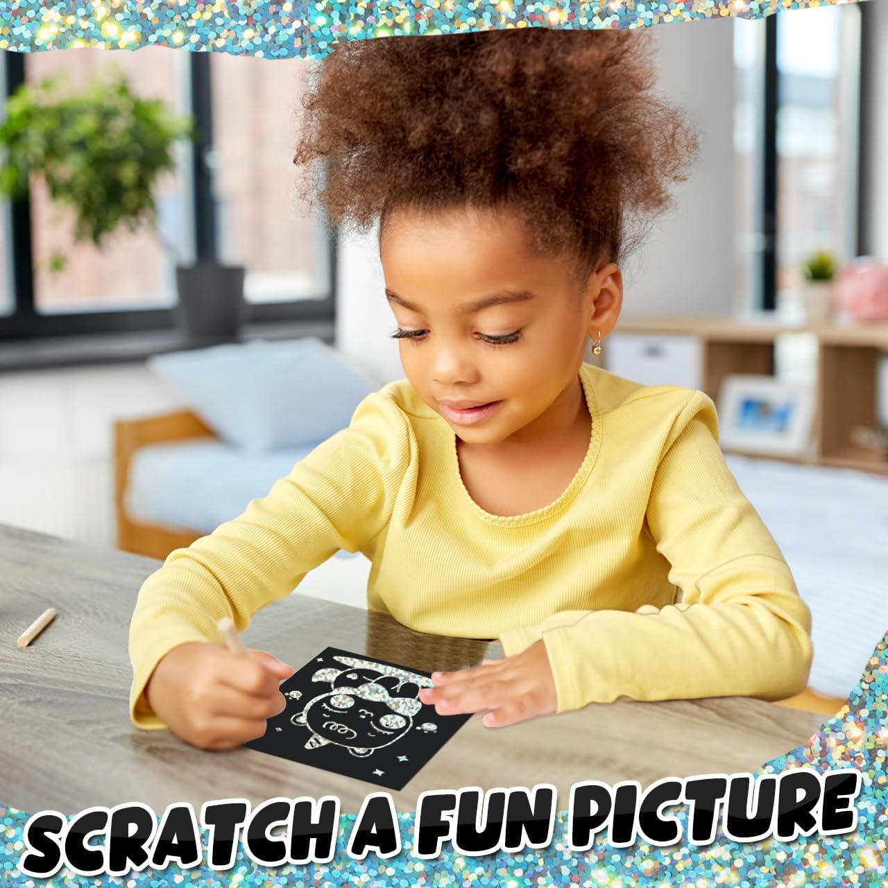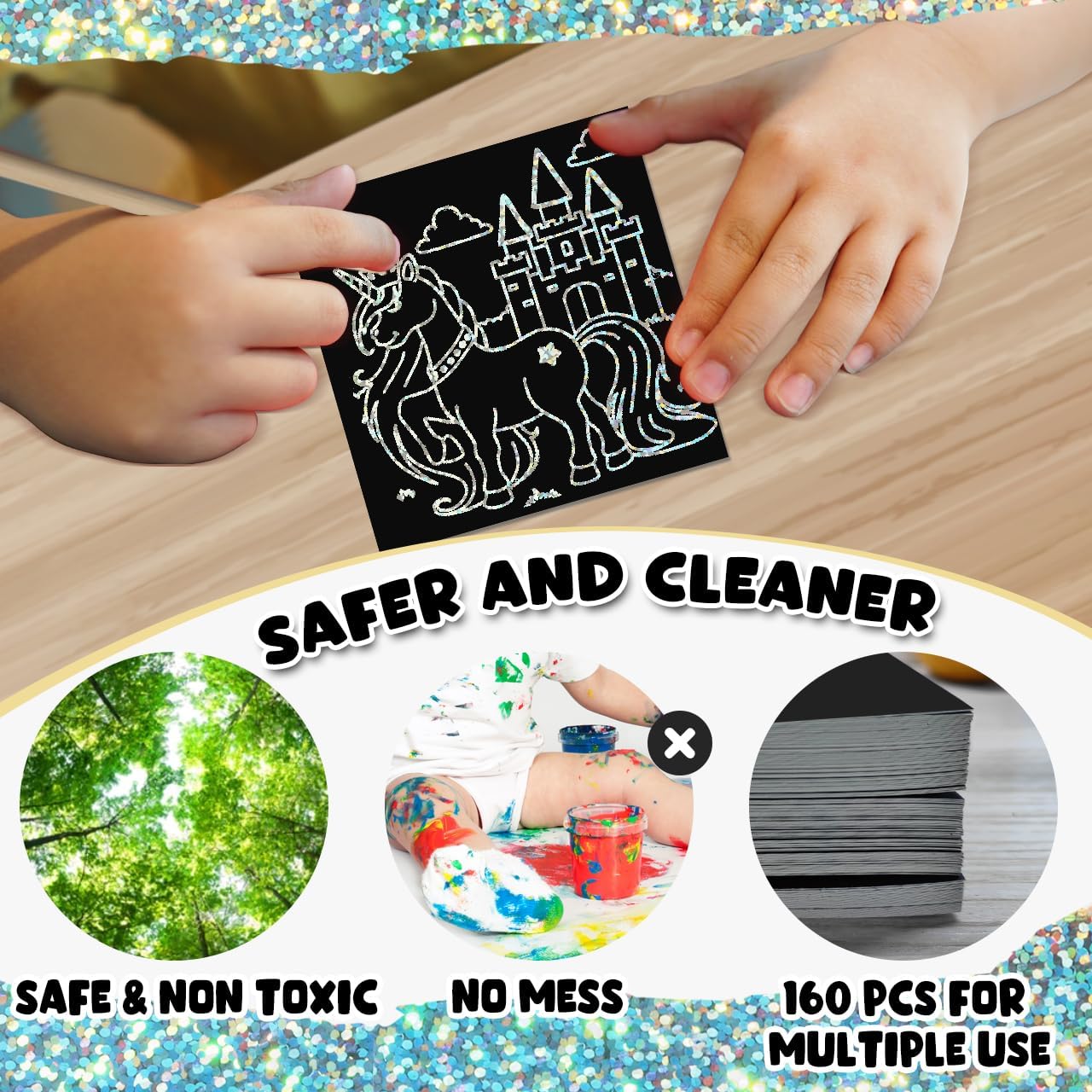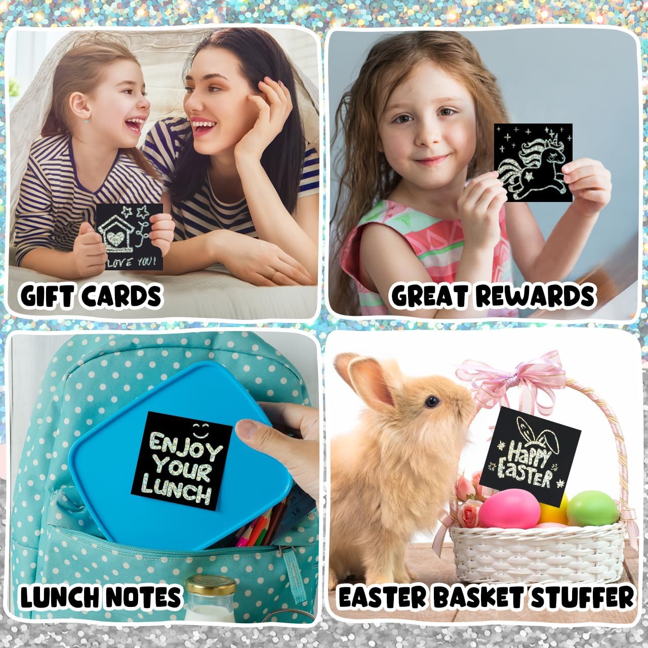 - Create Sparkling & Amazing Artwork: The scratch paper art notes is covered with silver glitter holographic layer. Just scratch away the black matte surface and the holographic materials will flash different dazzling colors and luster at different angles under the sun or light. This black scratch off paper let kids take the time to play, think, and create their inconceivable masterpieces