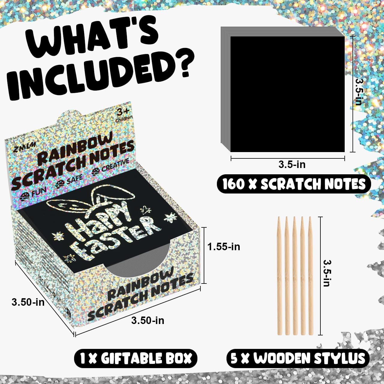 - Silver Scratch Art Mini Notes: Our scratch art paper with 160 sheets of holographic scratch paper note cards (Size: 3.5*3.5inch /8.5*8.5cm) and 5 Styluses(3.5inch/8.5cm). Super Bulk kids art craft kits for fun way to doodle, leave notes, write Lists and and create cool illustrations and designs. Both kids and adults love exercising their imaginations with this bulk art craft gift