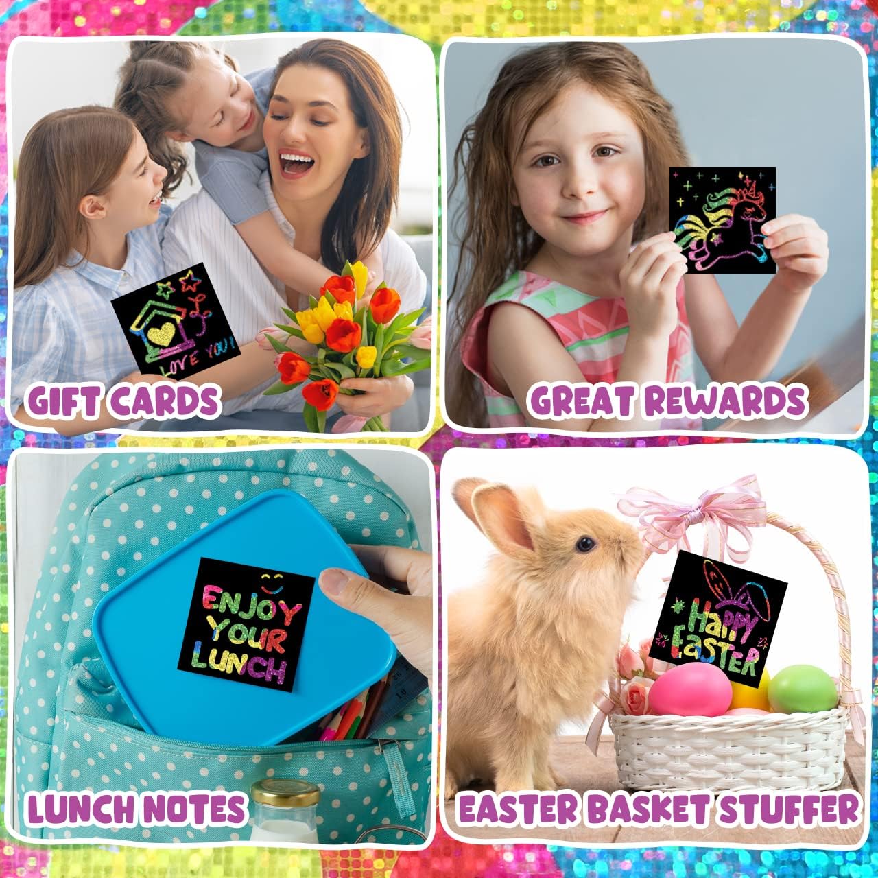 - Rainbow Scratch Mini Art Notes: Our scratch paper art with 160 sheets of holographic scratch note cards (Size: 3.5*3.5inch /8.5*8.5cm) and 5 Styluses(3.5inch/8.5cm). Super Bulk arts crafts kits for fun way to doodle, leave notes, write Lists and create cool illustrations and designs. Both kids and adults love exercising their imaginations with this creative rainbow art craft gift ideas