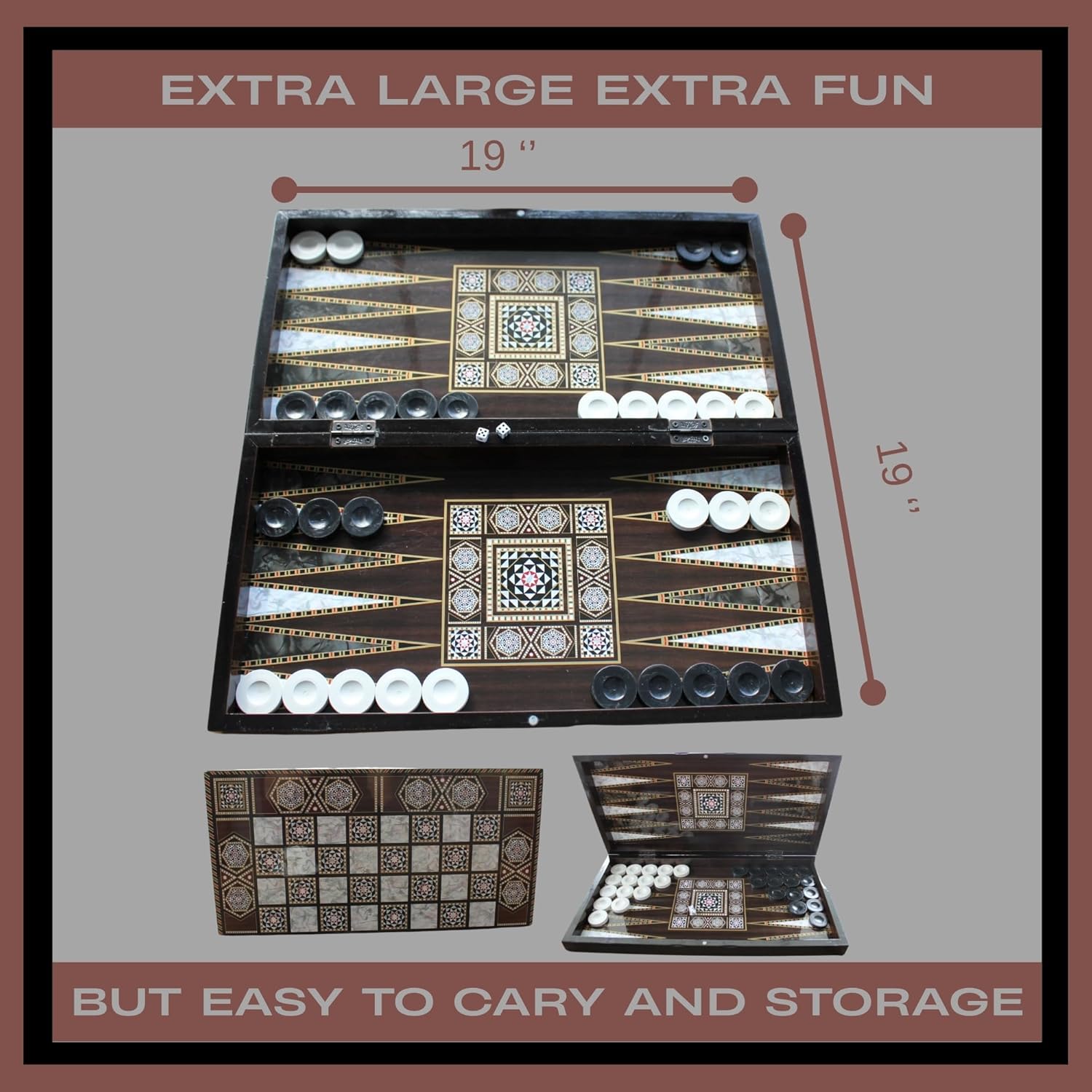 Park Oz Pearl Premium Turkish Backgammon and Checkers Set 19 Inch Handmade 2 in 1 Wooden Board Game with Glossy Finish Luxury Checkers and Dice Travel Friendly and Foldable