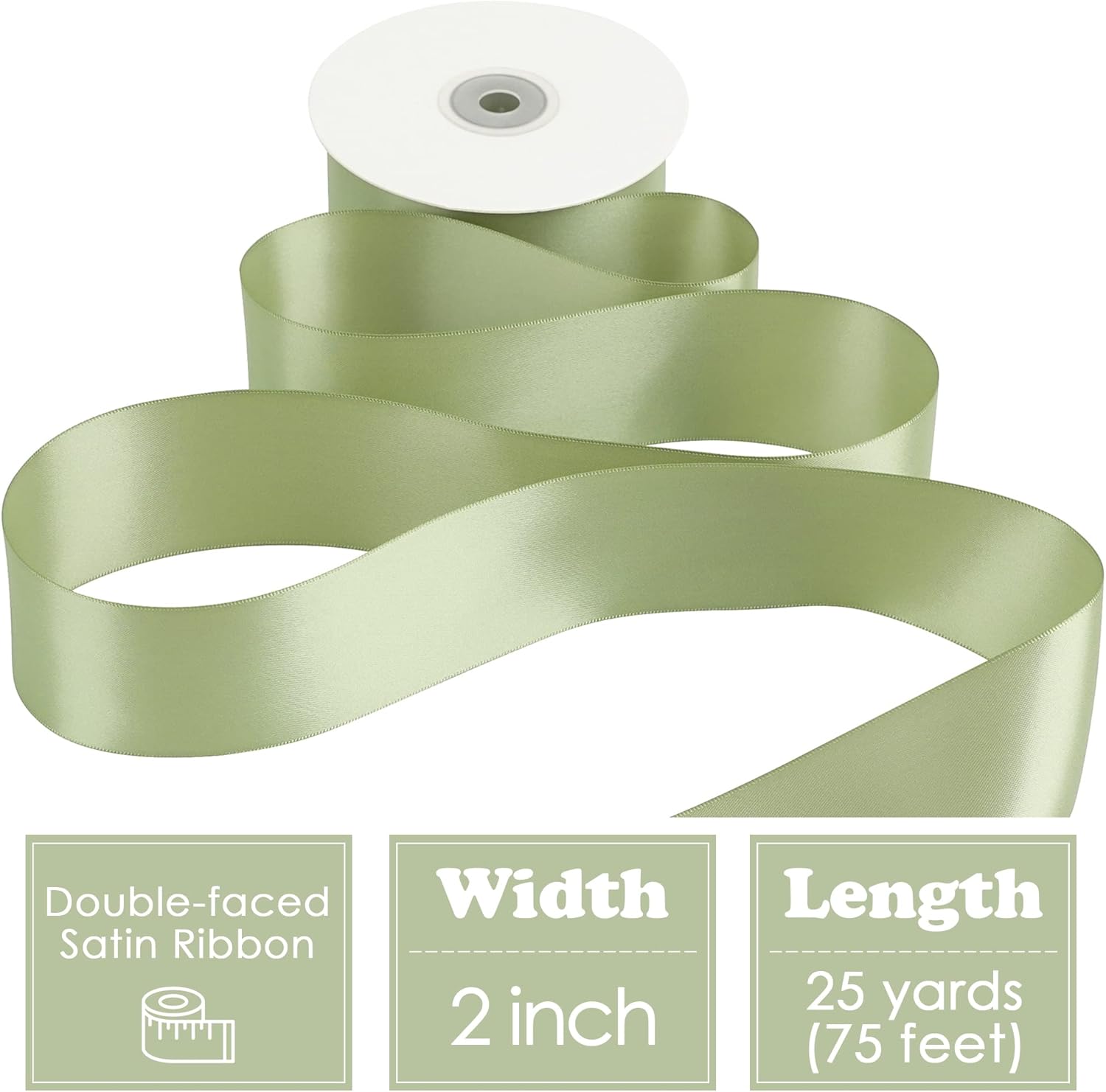 - Size: Sage green ribbon is 2" wide and continuous 25 yards(75 feet) long in a paper box. Perfect size for various decoration and crafts, such as decoration for party, flower bouquet, gift wrapping, indoor and outdoor decor and all ribbon crafts making