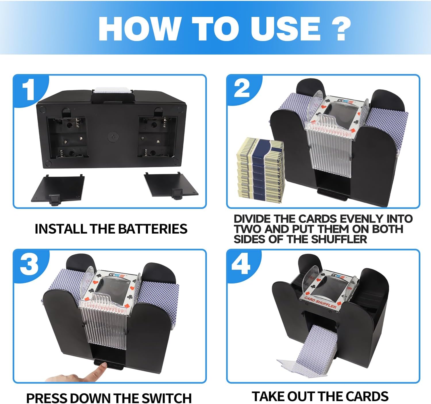- Important Tip: The card shuffler requires four C batteries if you use batteries to operate ( batteries not included); flat cards and new cards work great, bending cards or old cards may not work (playing cards are not included)