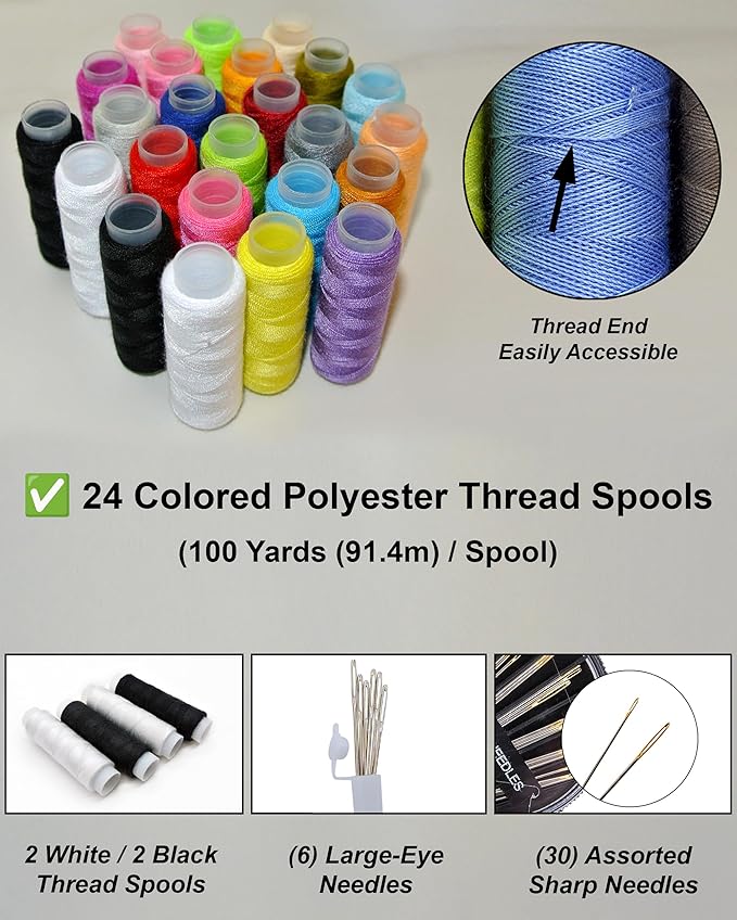 - Included Components : (1) Seam Ripper (1) Nail Clipper (1) Tweezers (2) Metal Thimbles, (2) Needles Threaders (1) Fabric Pencil (1) Magnet (2) Quilting Clips, (3) Black and (3) White Plastic Buttons (10) Safety Pins (10) Color Pins, (6) Large-Eye Needles (1) Stainless Steel Scissors (6) Metal Buttons, 24-Color Polyester Threads, 30-Assorted Needles (1) Measuring Tape (IN/CM) (1) Seam Ripper (1) Nail Clipper (1) Tweezers (2) Metal Thimbles, (2) Needles Threaders (1) Fabric Pencil (1) Magnet (2) Quilting Clips, (3) Black an… See more