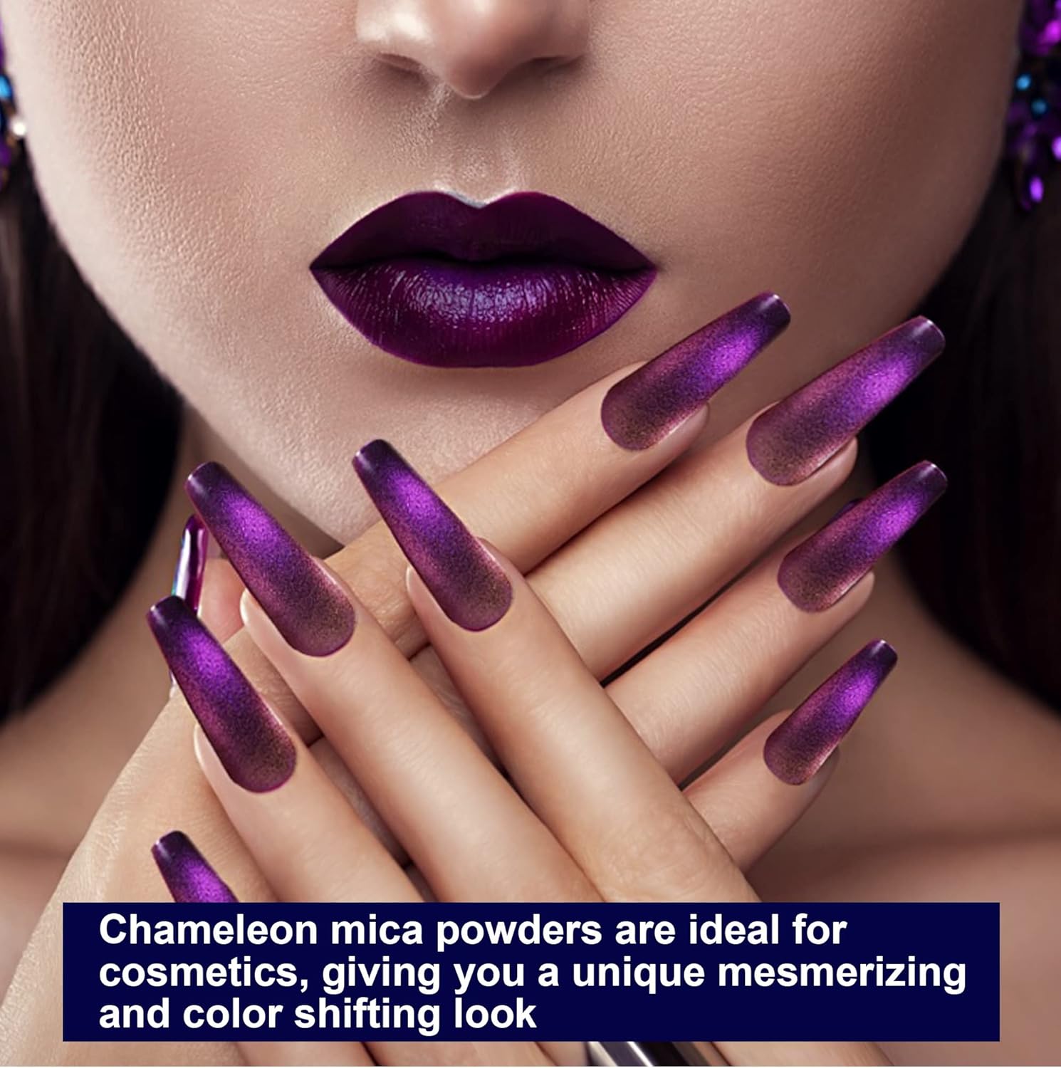 - ❤️ CHAMELEON MICA POWDER QUALITY - The set includes 8 chameleon mica powders. Each jar contains 0.1oz / 3g bottles covering hues of all shades with an eye-catching color changing and shimmering glow.