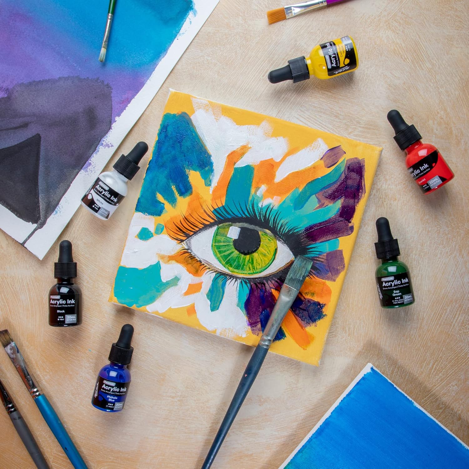 - 12pc vibrant acrylic Inks: White, Cadmium Yellow, Orange, Scarlet, Bright Green, Sap Green, Teal, Phthalo Blue, Violet, Yellow Ochre, Burnt Umber, Black