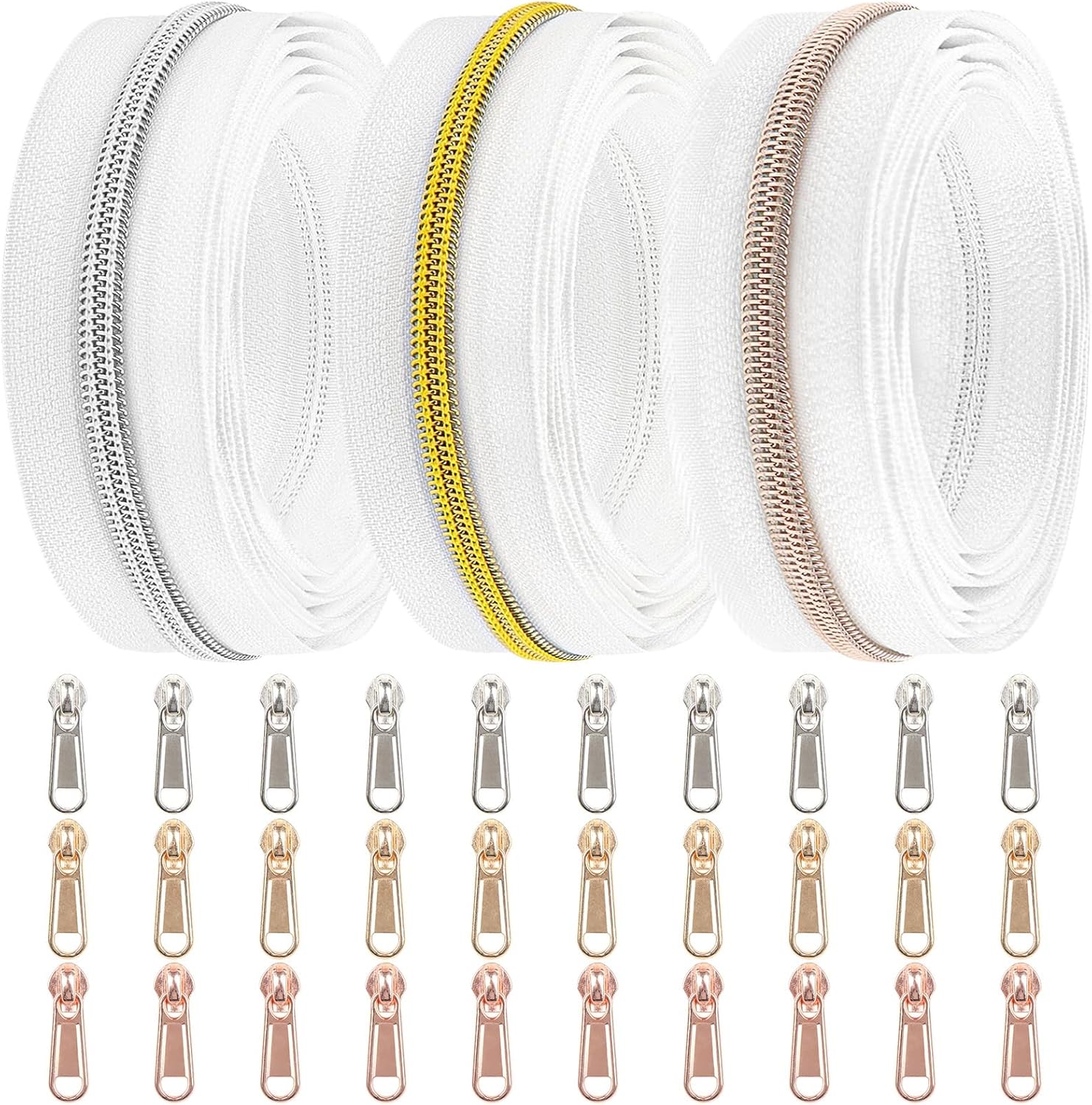 DOITEM 16.5 Yards 3 Pieces Sewing Zippers #5 Nylon Coil Zippers Assorted Zipper for Sewing with 30 Zipper Sliders for DIY Tailor Sewing Crafts Supplies, White
