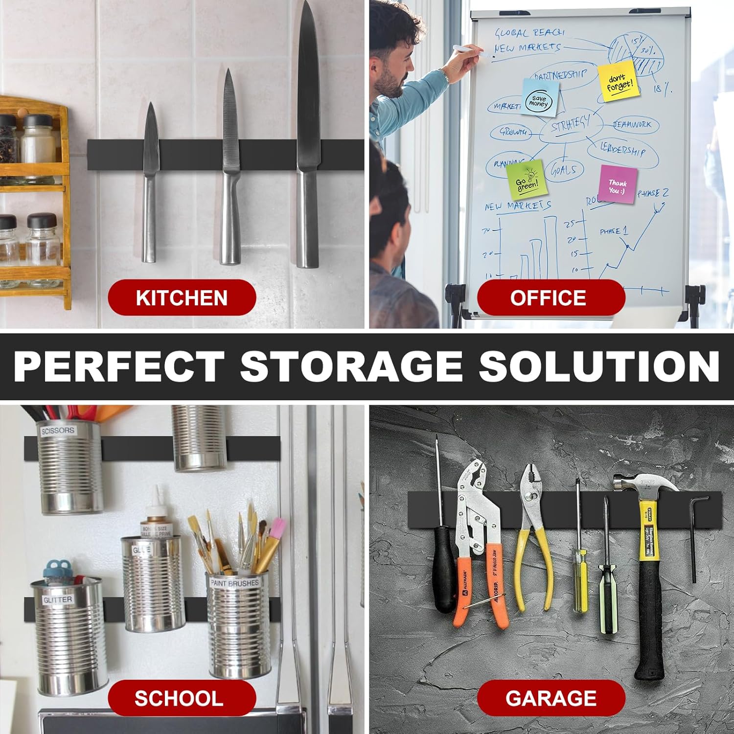 - 【WIDE APPLICATION】The strong adhesive magnetic tape strips with adhesive backing connects the objects easily with magnetic boards (e.g. whiteboards, blackboards ) and fridges, can be used as magnetic tool holder strip for wall, flexible knife magnetic strip, 3m magnetic key holder, magnetic garage tool, magnetic screw holder and tool stand for garage storage and kitchen magnetic fridge organizer.