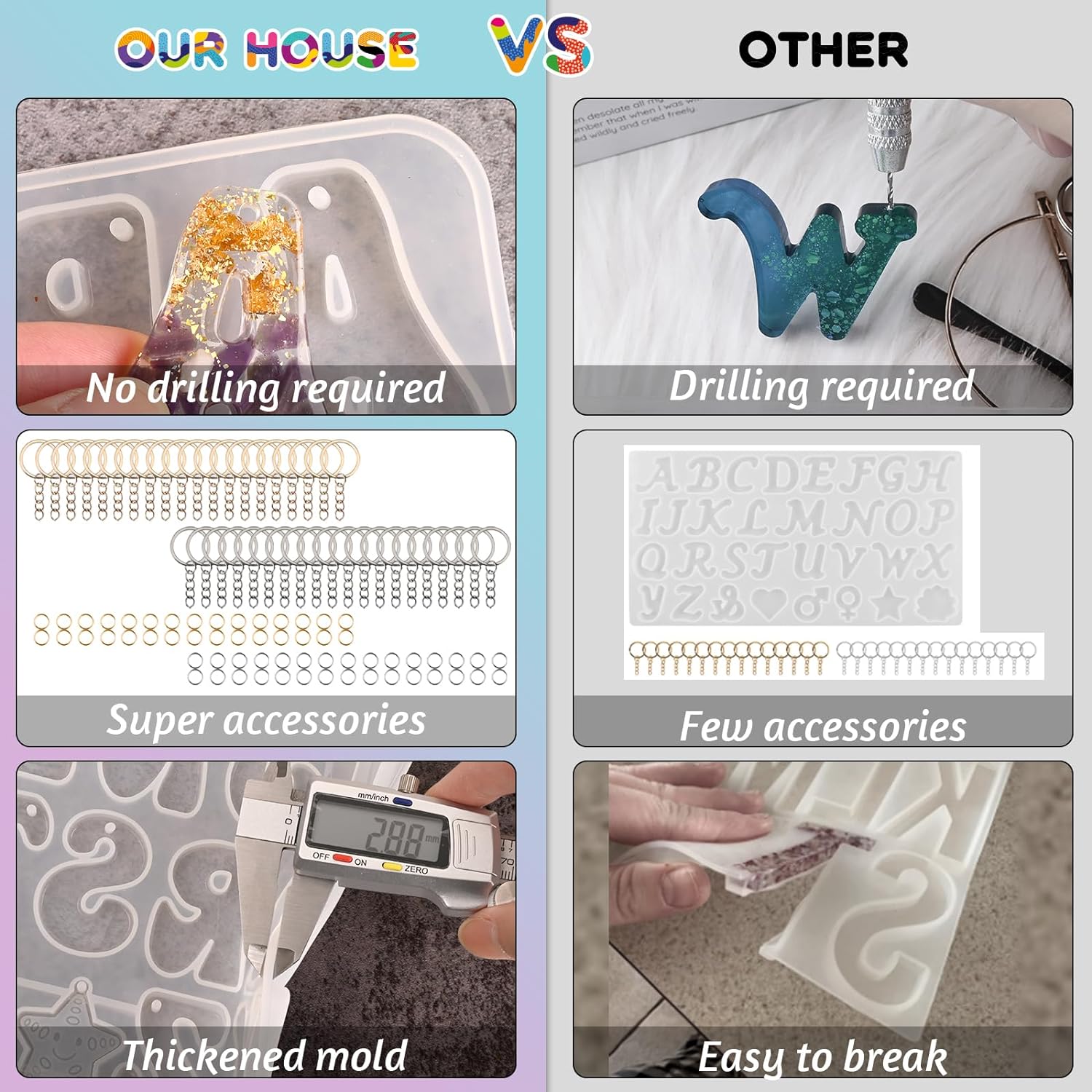 - Package Include: Resin alphabet molds kit Include 20pcs gold key rings and 20pcs silver key rings, also 60pcs jump rings(gold and silver), with these complete kit you don't need to buy keychain accessories separately,perfect for making your individualized resin keychains, pendants.