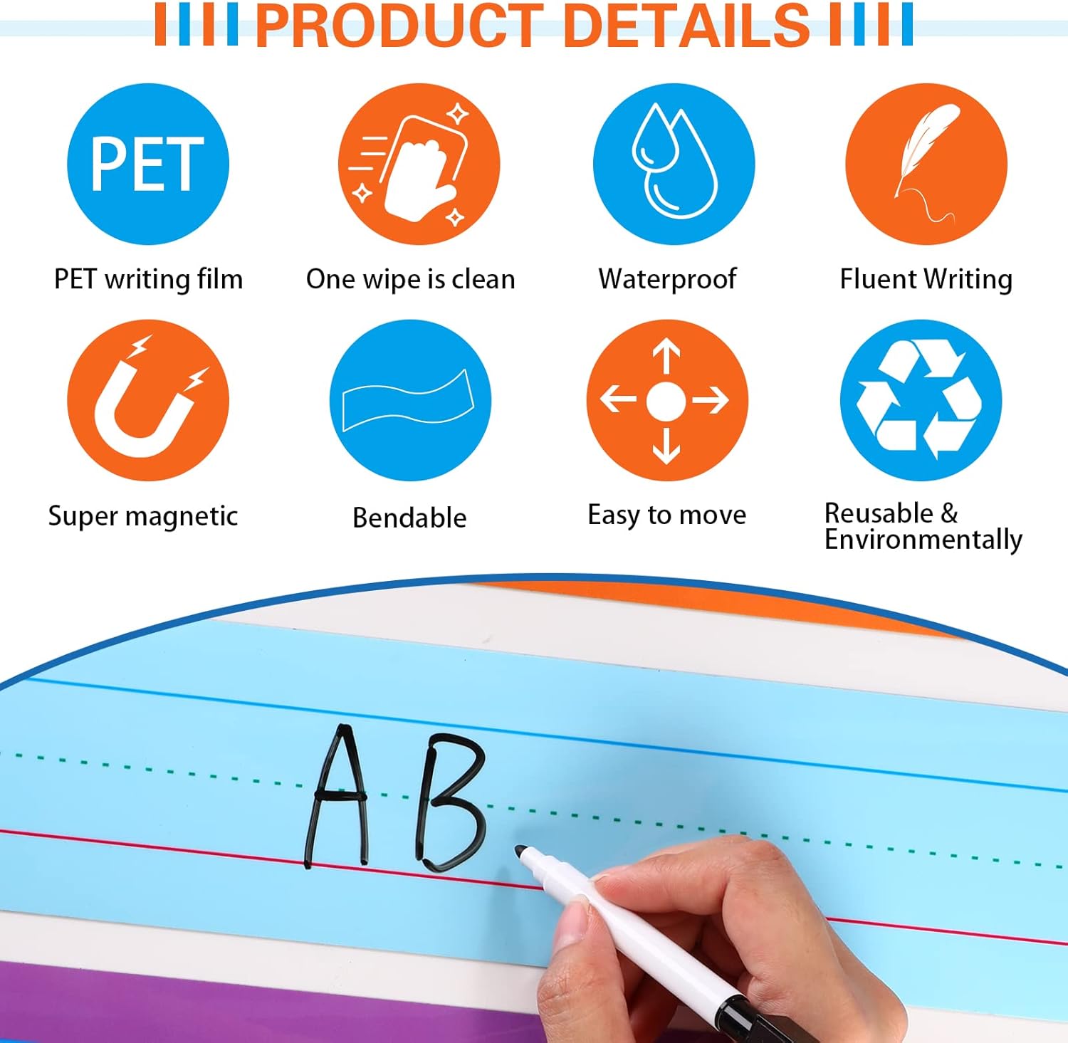 - Quality Material: these magnetic strips for whiteboard are made of polypropylene and PVC, which are waterproof and scratch resistant, durable and reusable; Printed with bright colors can easily attract children's attention; Each sentence sticker has distinct lines, so children can write letters correctly that can be erased repeatedly for practicality