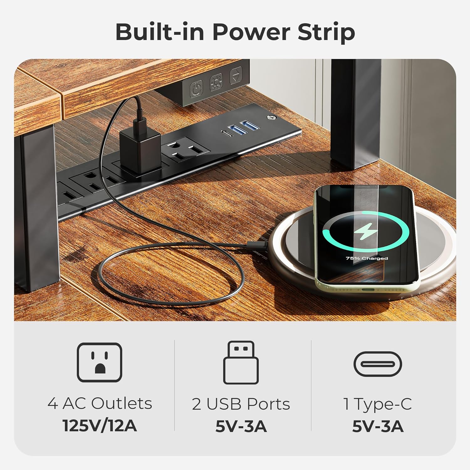 - ăPower Strips & Monitor ShelfăThis computer desk is equipped with 4 Standard Plug Outlets, 2 USB Ports and 1 Type-C port, which can easily charge phones laptops, gaming gear and other office devices. Monitor stand on the desktop elevates your line of sight, allowing you to maintain proper sitting posture and protect your cervical and spinal health.