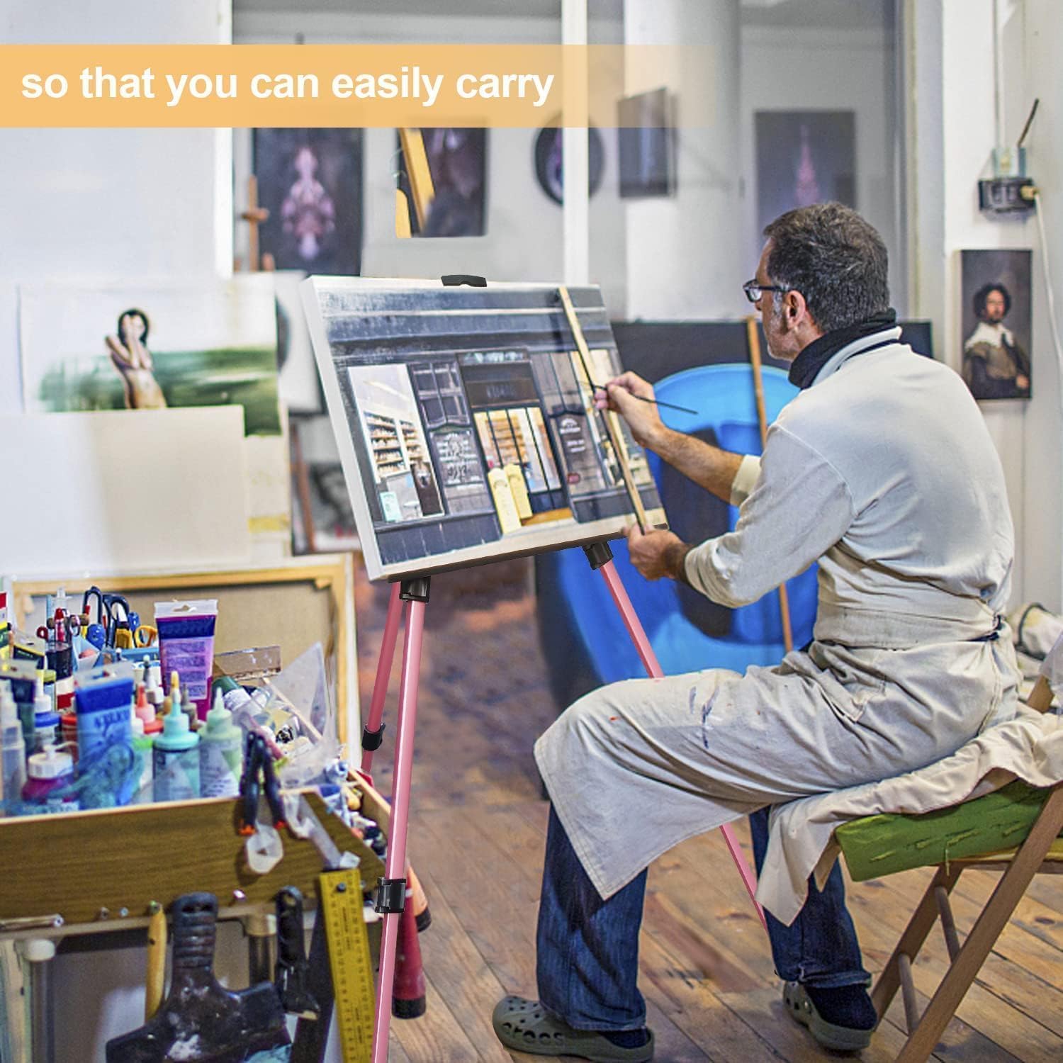 - [MATERIAL AND STABILITY PERFORMANCE] painting stand adopted sturdy and durable aluminum art easel Stand- lighter and more durable than other material easels; The spring clip on top of the tabletop easel stand makes the canvas less likely to fall
