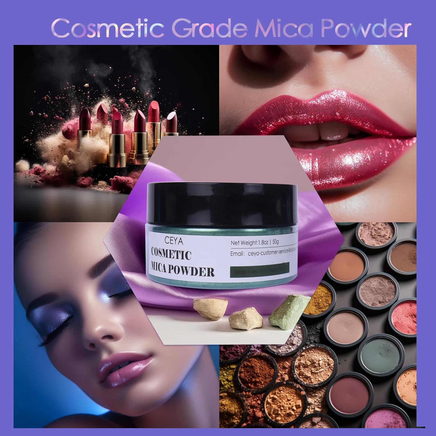 - 💄Cosmetic Grade Mica Powder: As a professional mica powder seller, Ceya highly pigmented mica powder is of artist-grade quality, and finely ground. Formulated for performance to provide performance with depth, luster, sparkle, shine and pearlescence effects, colorfast will not tarnish or fade. Cosmetic mica powder with high-temperature resistance is great work for makeup colorant,soap dye and candle dye.
