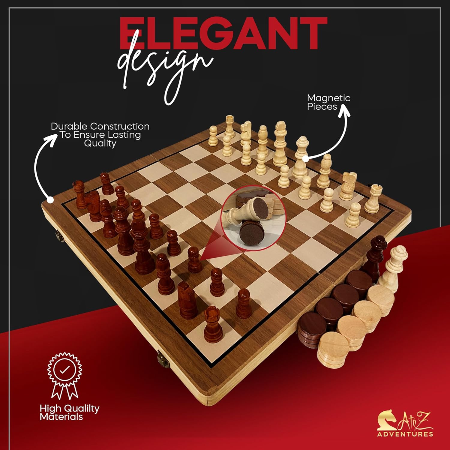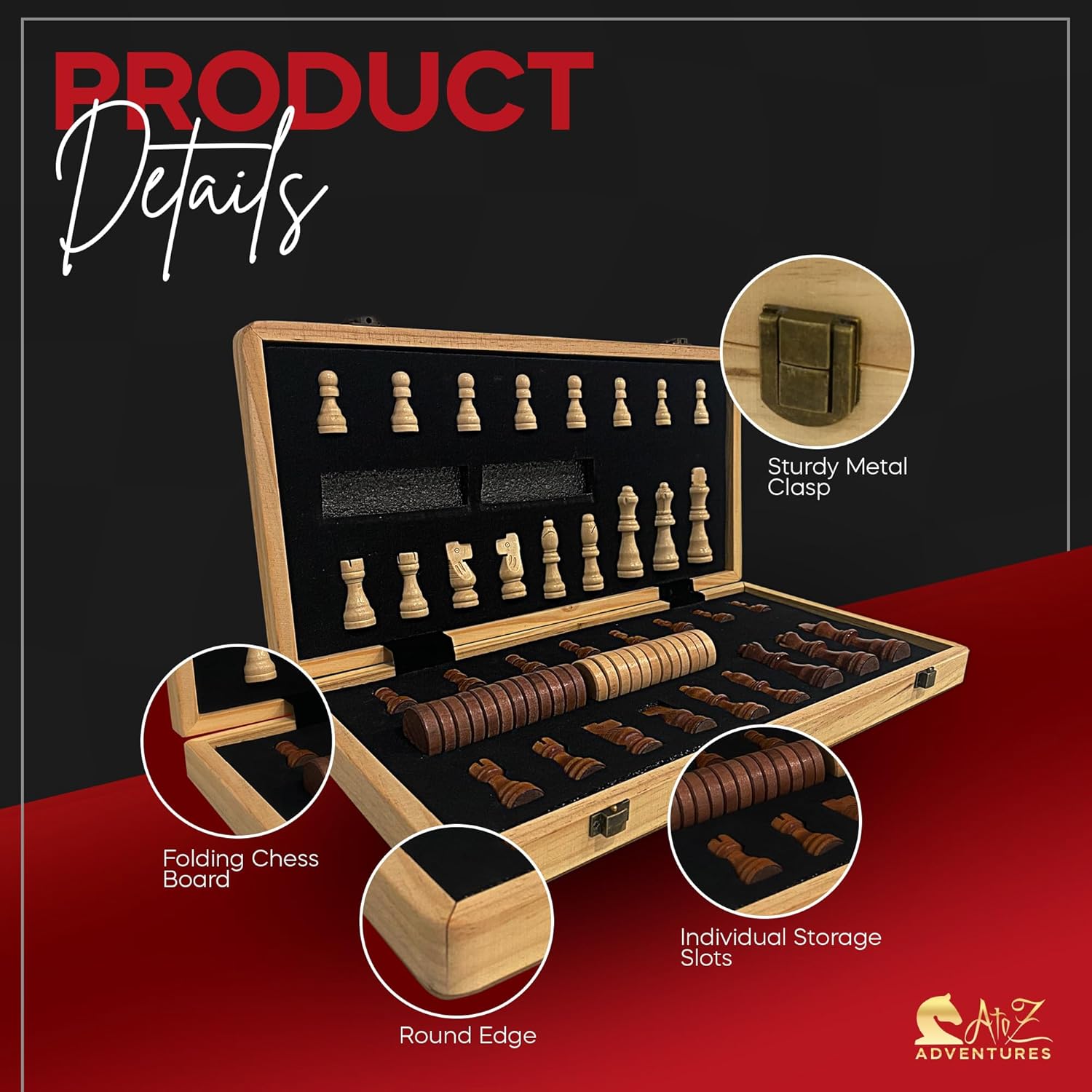 Magnetic Chess Set with Checkers - 15" (2 in 1) Folding Wooden Chess Sets for Adults & Kids with 2 Extra Queens | Travel Chess Board Game Set with Chess Pieces Storage Slots, Luxury Gift with Storage