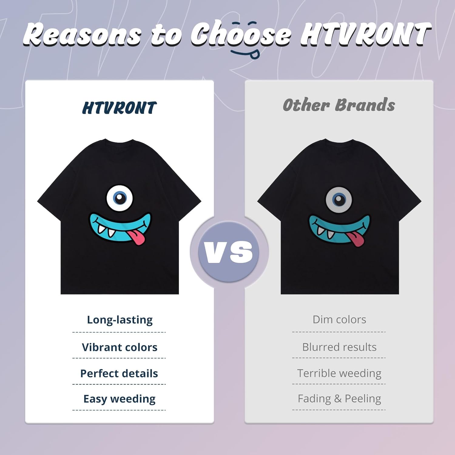 - 【Eco-Friendly & Versatile】 Made from 100% eco-friendly PU material, HTVRONT Heat Transfer Vinyl is safe for decorating clothing and accessories.Use our Heat Transfer Vinyl to customize T-shirts, dresses, sweatshirts, jackets, pillows, backpacks, and more.It's the perfect gift for birthdays, Christmas, anniversaries, and other special occasions.The possibilities are endless!