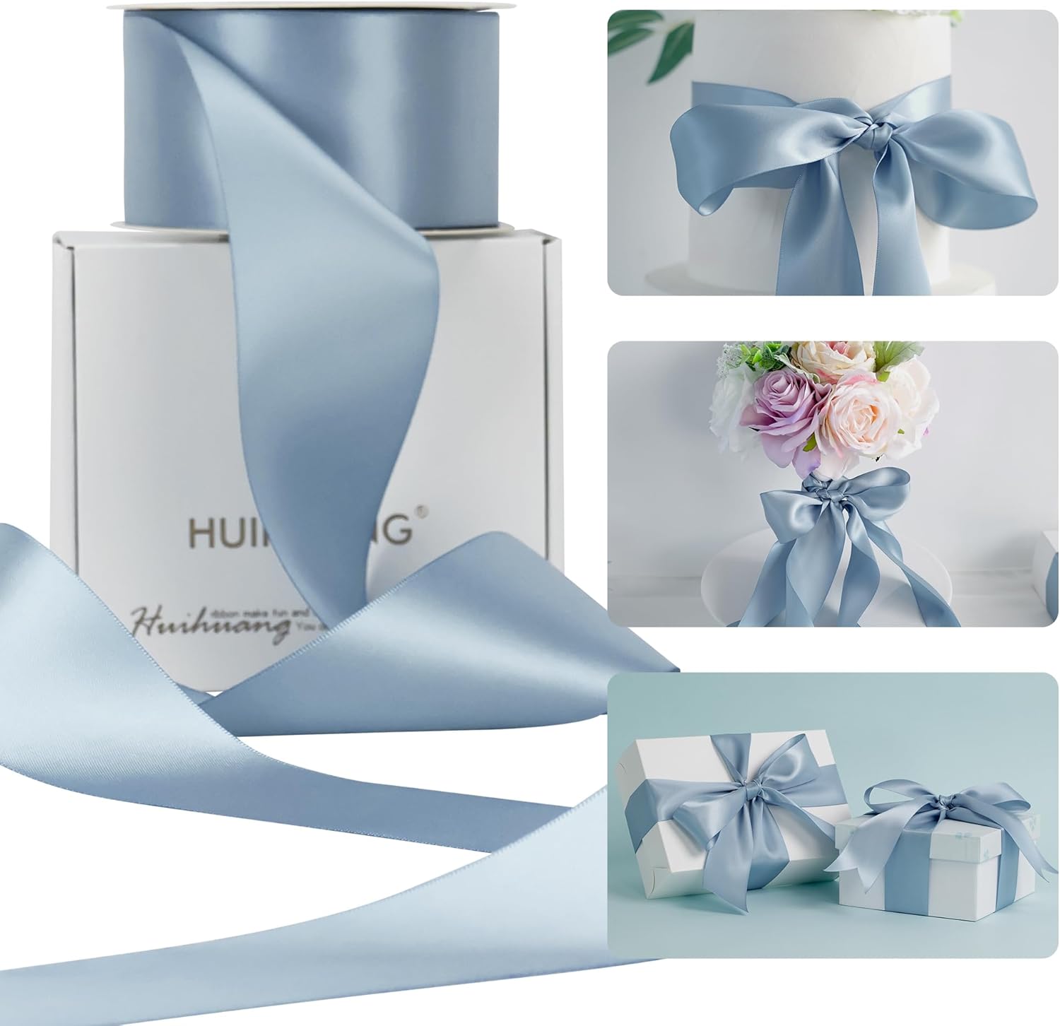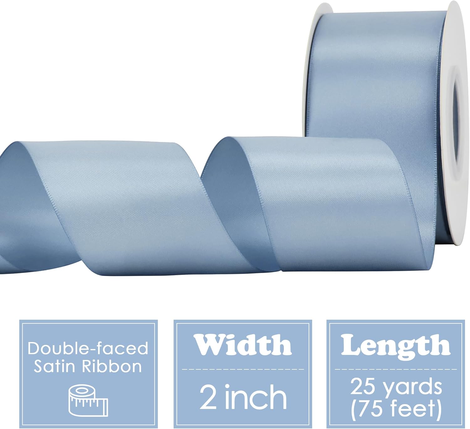 HUIHUANG French Blue Ribbon 2 inch Wide Double-Faced Blue Satin Ribbon for Crafts, Bows Making, Flower Bouquet Wrap, Gift Wrapping, Wedding Bridal Shower Decor, Home Decor -25 Yards/Roll