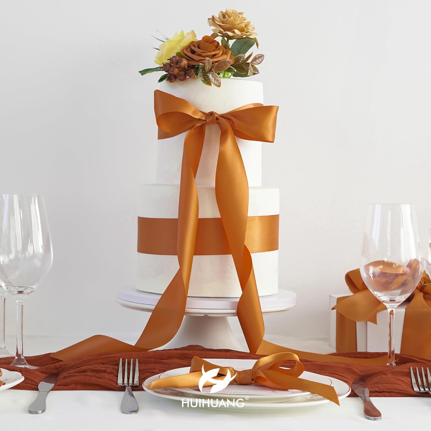 HUIHUANG Burnt Orange Ribbon 2 inch Wide Double-Faced Orange Satin Silk Ribbon for Flower Bouquet Wrap, Gift Wrapping, Fall Wedding Decor, Crafts and Bows Making- 25 Yards/Roll