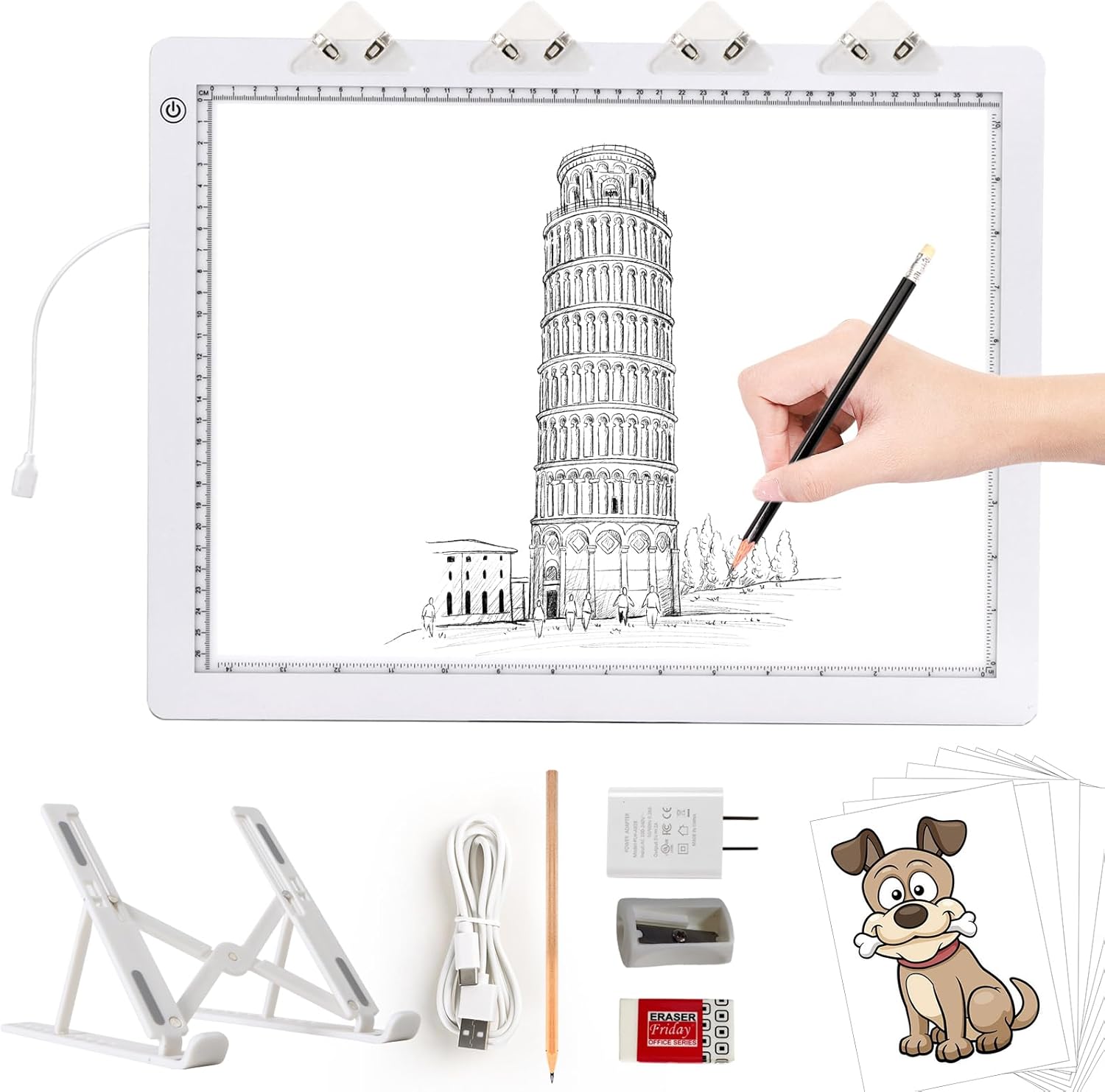 - 【 Package Included 】 1 * A3 Super Bright Pad, 1 * Light Pad Stand, 1 * 5V2A UL Certified Adapter, 4 * Clips, 1 * 1.8m Type-C Cable, 1 * Pencil, 1 * Pencil Sharpener, 1 * Eraser, 10 * Tracing Papers and 1 * User Manual.
