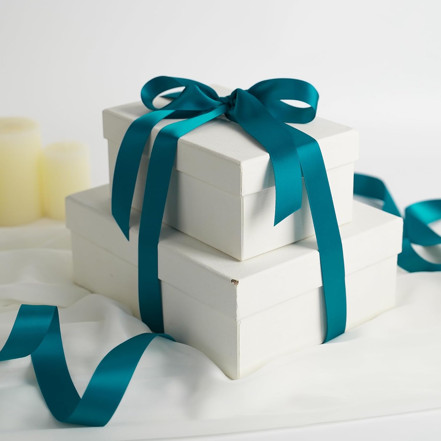 - Size: Peacock blue ribbon measures 1" wide and continuous 50 yards(150 feet) long in a complete roll in a paper box. Perfect size for various decorations and all ribbon crafts making