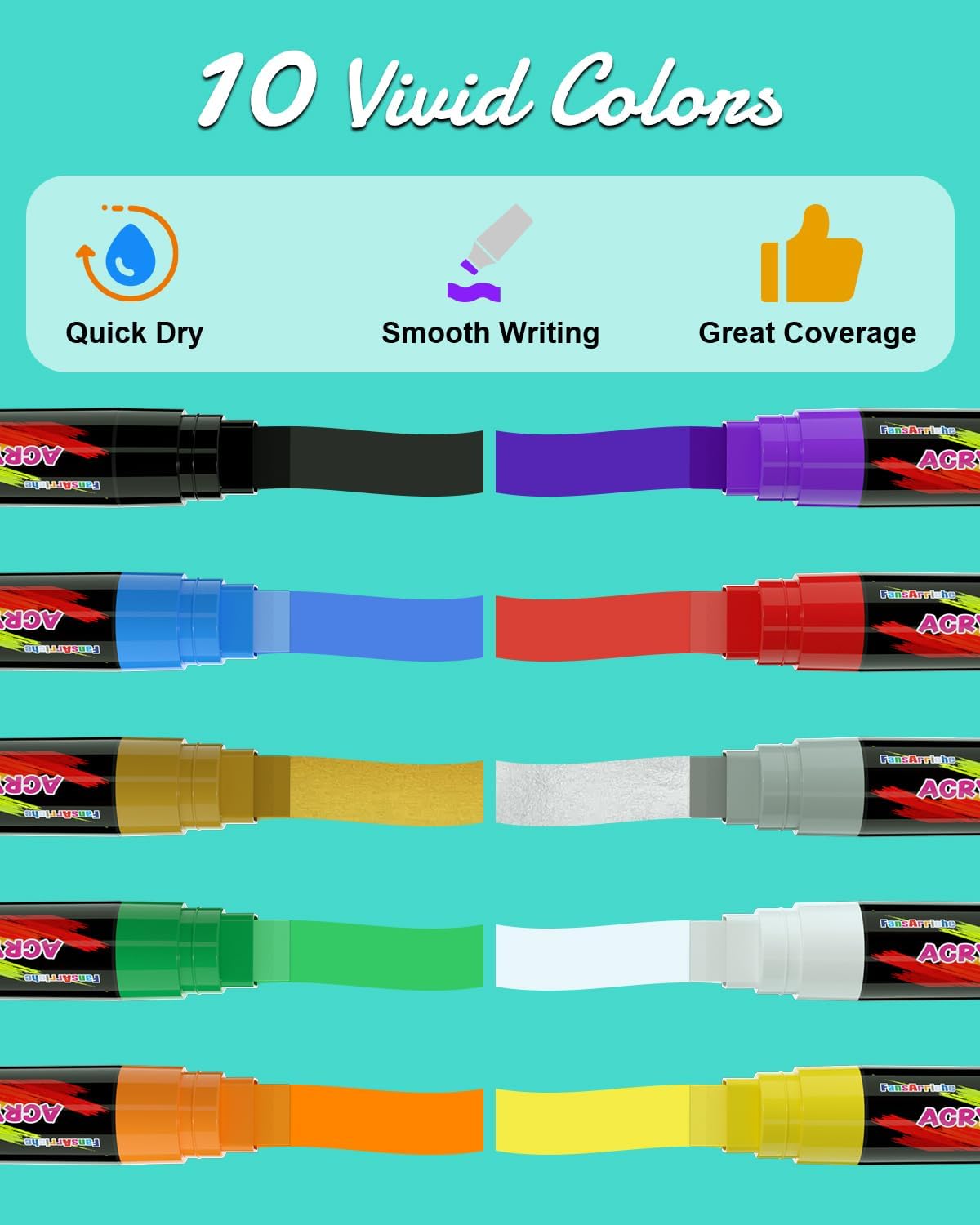 - Vivid Colors and Superior Quality: Our 15mm Jumbo Acrylic Paint Markers come with exceptionally vivid colors(Red, Purple, Green, Yellow, Blue, Orange, Black, White, Gold, Sliver)that stand out on any surface. They are filled with high-quality water-based permanent acrylic ink, ensuring smooth application and excellent coverage.