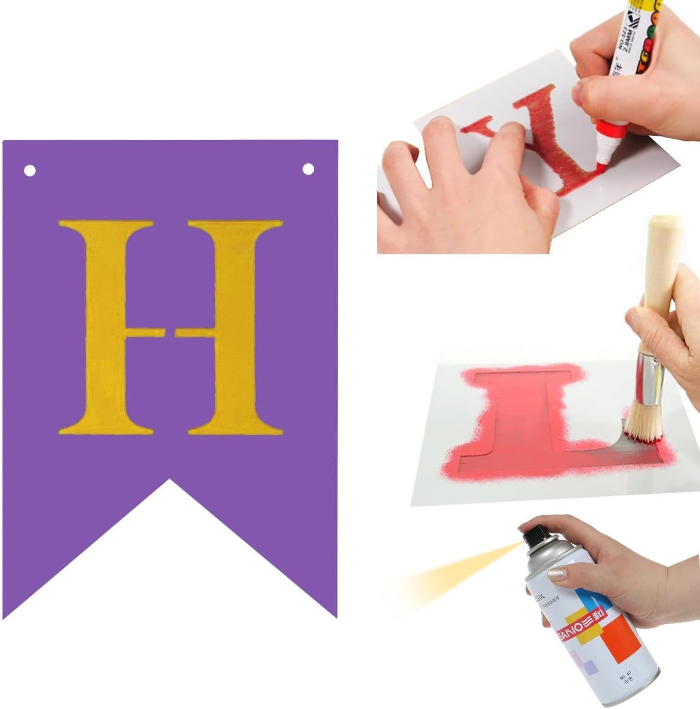 - Customized Signs Banner: Come with 18 pcs blank paper pennant and a set of A-Z letters stencil, each flag measures about 4.5X6.5inch. 26 letter stencils, each stencil measures about 4.0*4.0inch