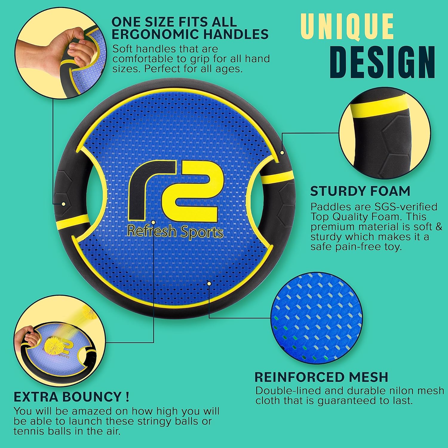 • š— š—Øš—Ÿš—§š—œš—£š—Ÿš—˜ š—šš—”š— š—˜š—¦, š—¢š—”š—˜ š—¦š—˜š—§: Easy to pick up and play Badminton, Tennis, Baseball, and so much more! With the stringy balls and paddle's bouncy mesh, you can easily transition between games that would normally require separate equipment. You can even swap the rubber balls for water balloons on hot summer days for some extra splashy fun!