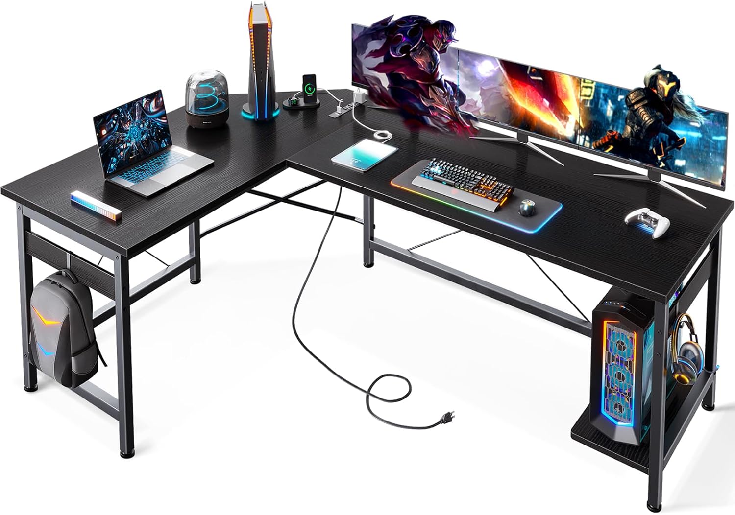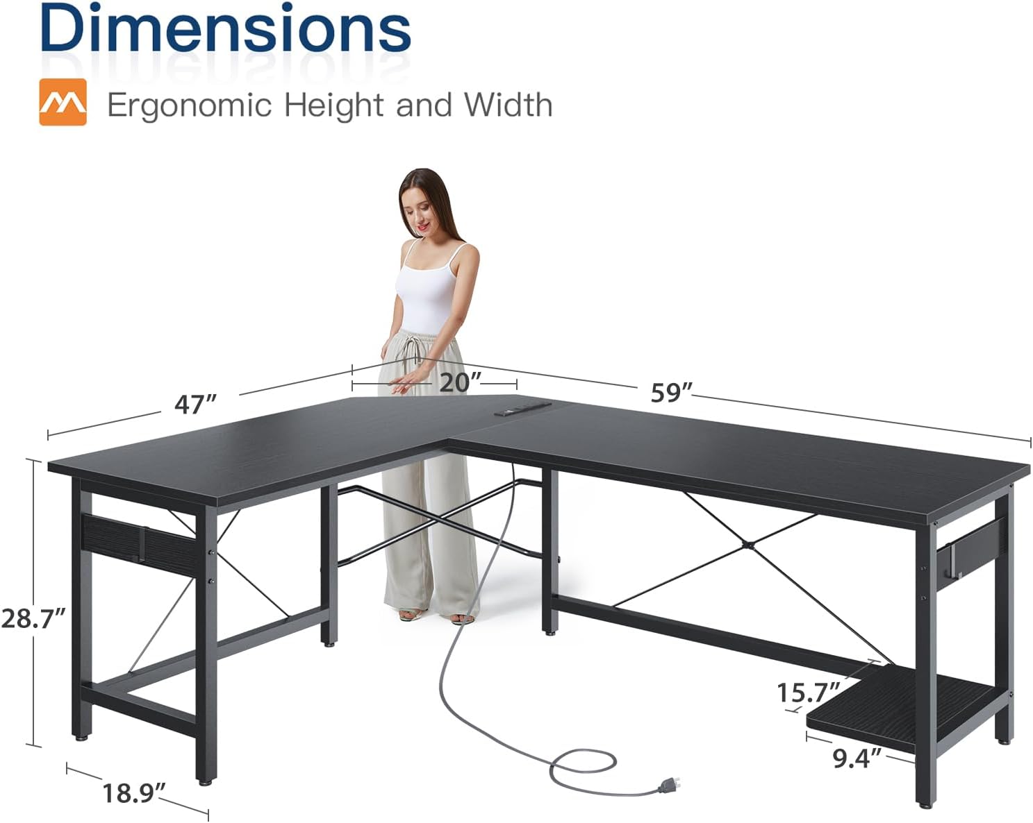 Coleshome 59" L Shaped Gaming Desk with Outlet, L Shaped Desk with CPU Stand, Corner Computer Desk, Home Office Desk, Writing Desk, Black