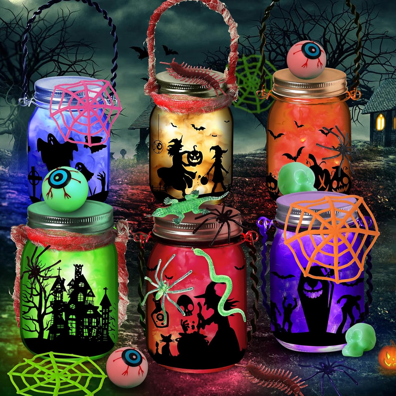 - Halloween Craft Set:You will get 6 glass mason jars of Halloween DIY Lantern Jar crafts. The Halloween crafts kit contains everything you need,including 6 LED light Strips, each jar 2 for replacement, 6 different styles of silhouettes (witches, pumpkins, graveyards, ghosts, etc), 6 packs cotton webs (green, Red, purple,white, orange) .The accessories toys including grow in the dark eyeballs, bugs, spiders, Skulls. Ideal for Halloween party favors, school classroom Halloween craft and art party.