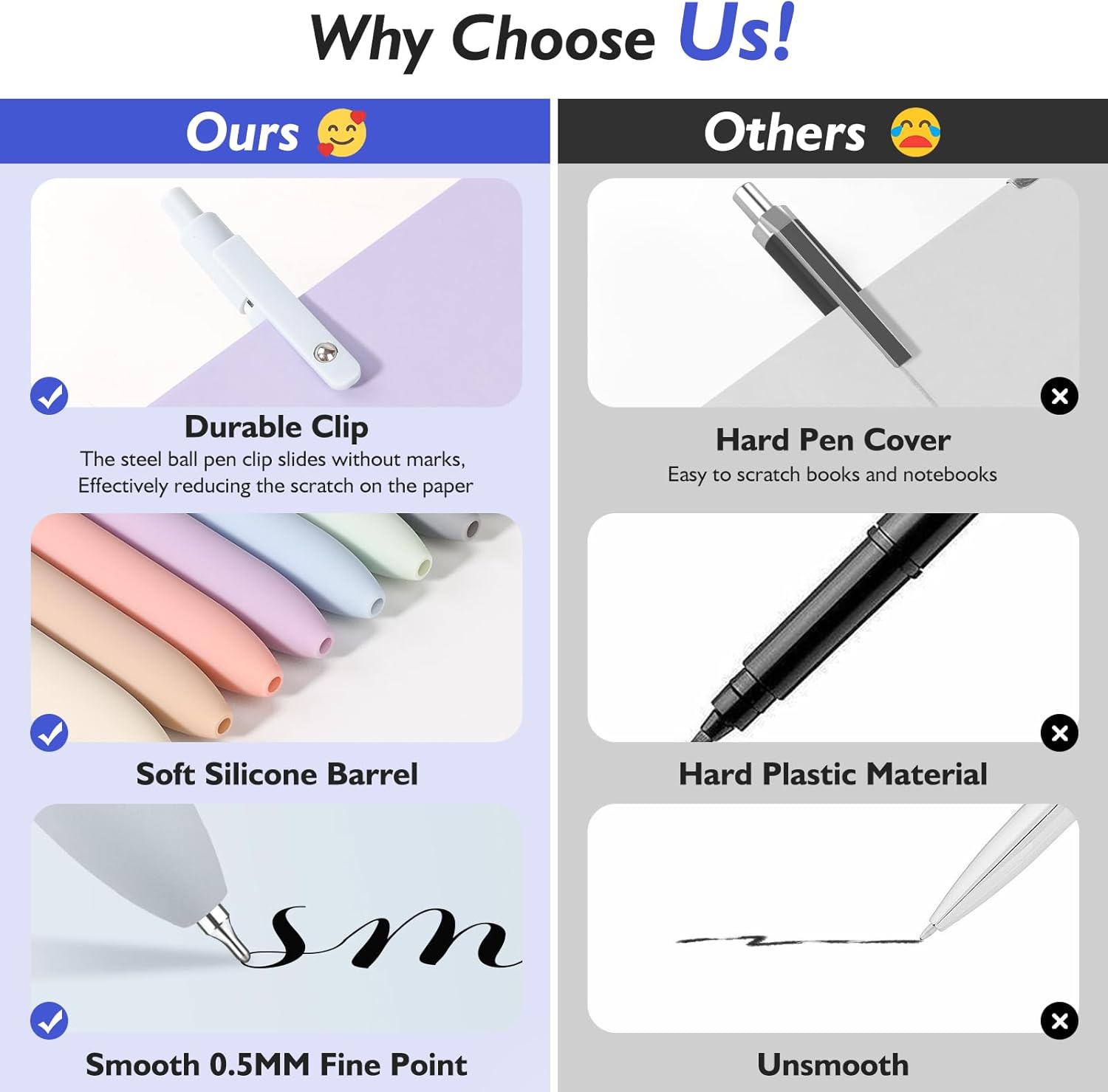 - 【Fidget Stress Ball & Smooth Writing Experience】 Soft silicone features grip brings a super soft touch feeling which makes each gel pen easy and comfortable to hold. The 0.5mm pastel type cute pens feature a fine point and deliver quick-drying ink, they ensure a seamless, precise, and smooth writing experience every time, and allow you to effortlessly glide across the page, making them the perfect office essentials for businessmen, office desk accessories, school supplies for college students and high school students. With a retractable design, gel pens are easy to use and store, making them perfect for on-the-go writing needs.