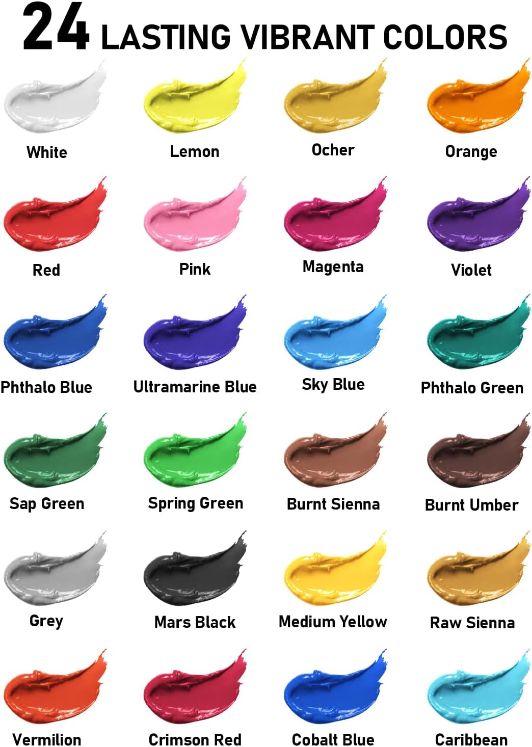 - Artist-Quality Paints Set: This set features 24 premium acrylic colors, each in a 60ml/2oz bottle. It also includes 12 versatile painting brushes & a palette and a beginner's user guide with a color wheel. Perfect for both novices and experienced artists.