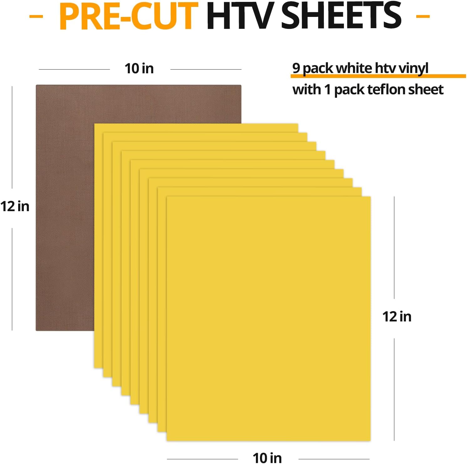 - 【PERFECT PRE-CUT SIZE】Our pre-cut 12*10 HTV fits most popular cutting mats and machines, easy and convenient to cut into different size of art designs or logos or letters. The combination of 9pcs of heat transfer vinyl and 1pc of teflon sheet can better meet your needs.