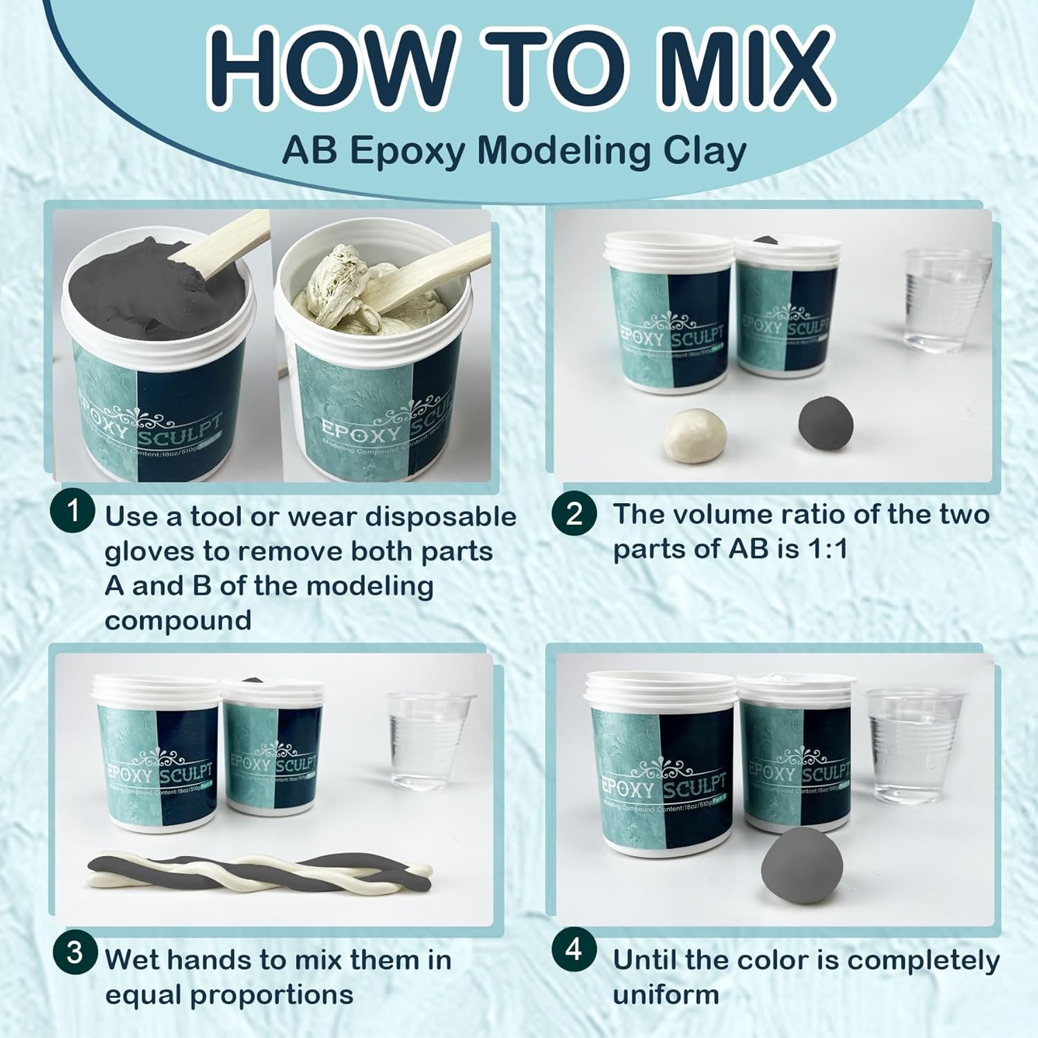 - This clay is a two-part epoxy clay that you can blend in a 1:1 ratio by volume. It has high stickiness and moldability, so you can form it into any shape you want. It will completely harden after 24 hours (the higher the temperature, the faster the hardening time), and it won’t shrink or deform after curing. You can also smooth, cut, carve, or paint it after it hardens.