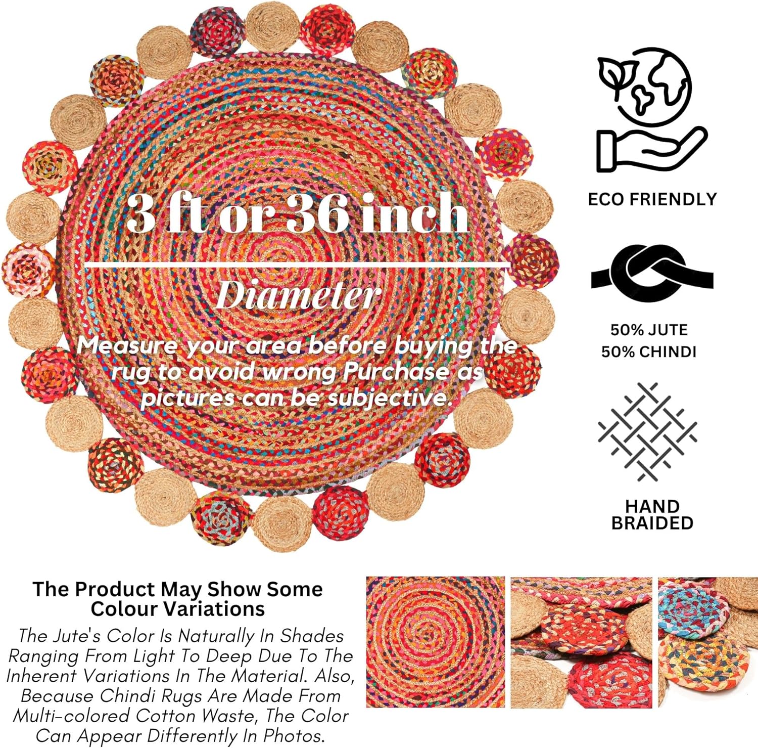 • Natural Materials - Our area rug is skillfully handcrafted in India using a blend of 50% jute and 50% chindi, showcasing exceptional quality and artistry. Due to its handmade nature, slight variations in color and size may occur, adding a unique charm to your home.