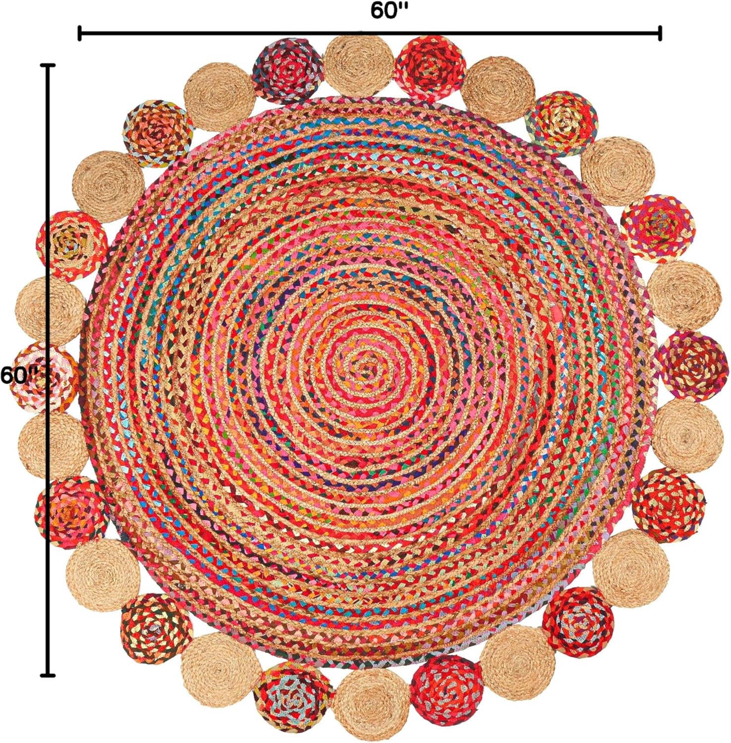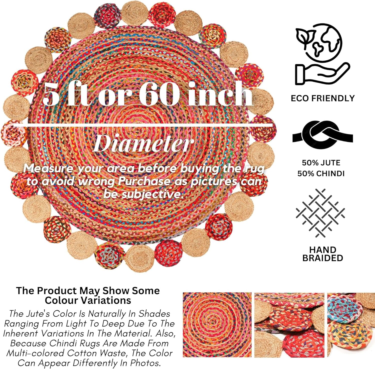 5' Round Handwoven Jute Chindi Area Rug - Colorful Boho Rugs for Living Room - Hand Braided Multicolor Bohemian Rug for Farmhouse, Bedroom, Dining Room, Classroom, Hallway, Kitchen, Office