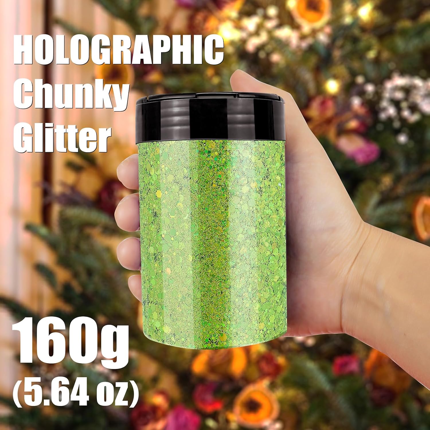 Holographic Chunky Glitter, 5.64oz/160g Extra Fine Glitter Powder Mixed Chunky Flake, Iridescent Sequins Bulk for Nail Art, Crafts Epoxy Resin, Festival Glitter for Party Decor (Dazzling Green)