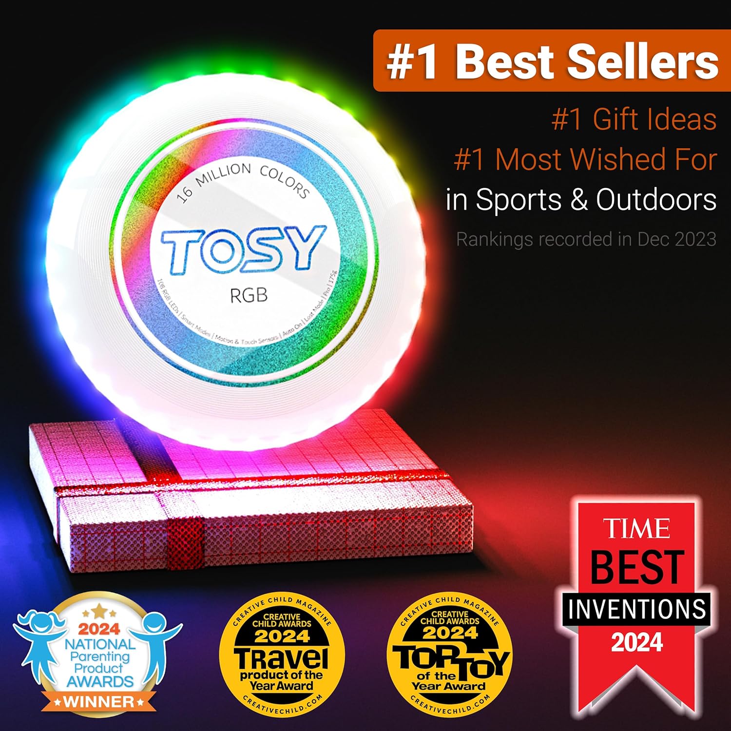 TOSY Flying Disc - 16 Million Colors RGB or 36 LEDs, Extremely Bright, Smart Modes, Camping Essentials for Teens/Kids/Adults/Men/Boys/Girls, Auto Light Up, Rechargeable, Waterproof, 175g
