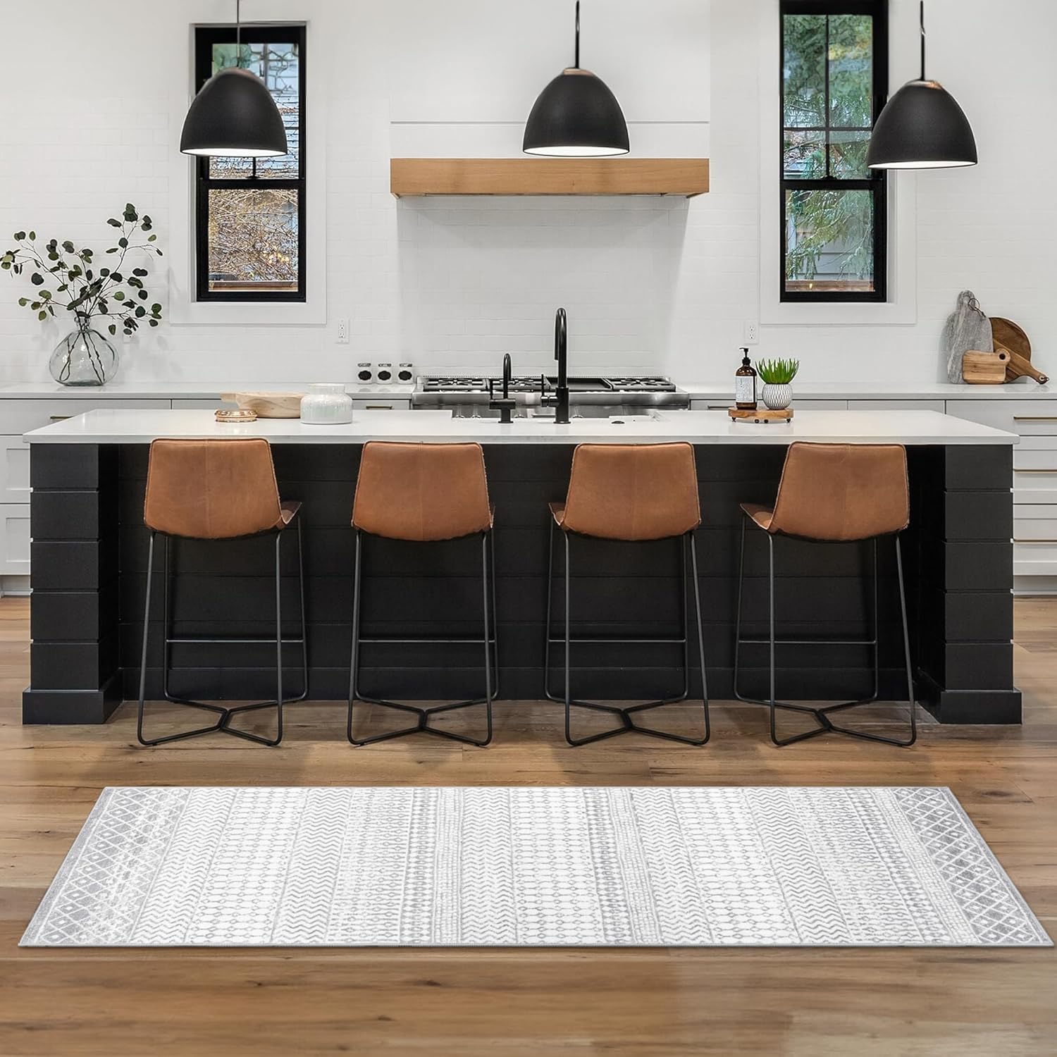 - Trendy Moroccan Design Rug: This farmhouse rug is designed with a Moroccan style pattern using a combination of geometric lines and shapes.The slight vintage feel created by the white and gray tones helps to establish a nostalgic atmosphere,suitablefor promoting a cozy and inviting feel to your space