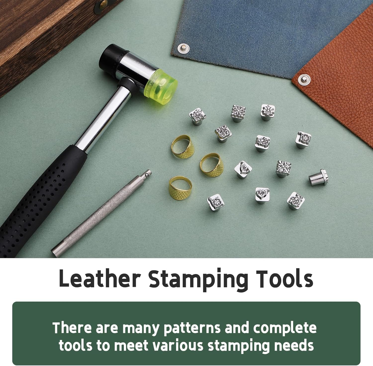 - Leather stamping tools: This leather stamping kit includes leather punch tools, 12 pieces of rattan pattern stamping stamps, 1 leather carving hammer and three golden thimbles. Suitable for leather crafting.