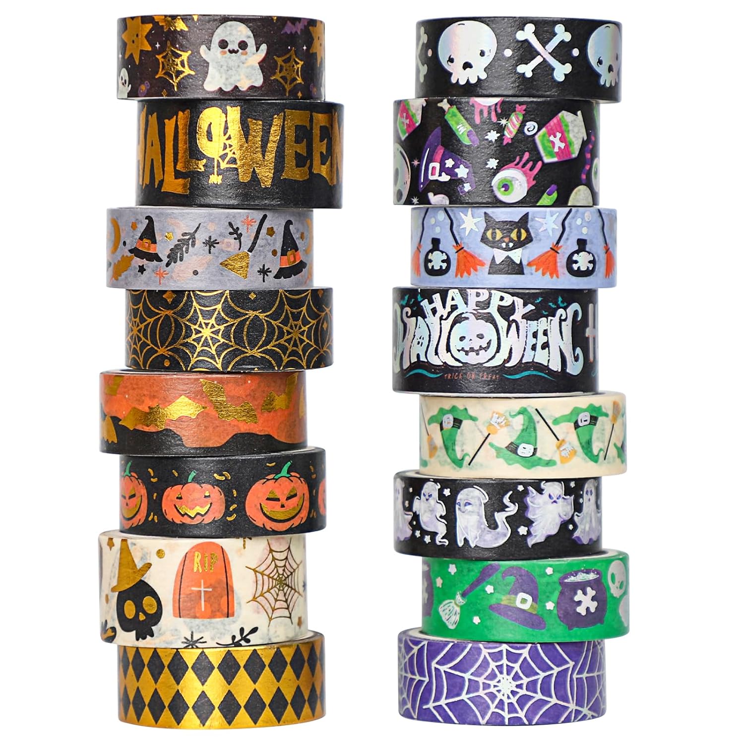 16 Rolls Halloween Washi Tape Holiday Masking Tape Stickers Glod Foil Decorative Tape for Scrapbook Journal DIY Craft Gift Wrapping(Halloween