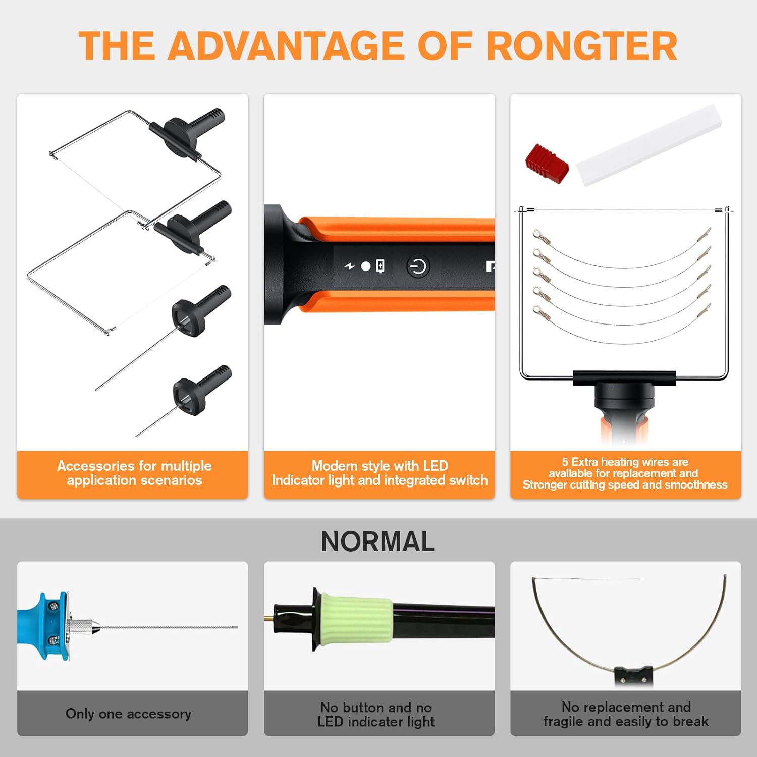 - 【Smooth and Efficient Cutting】Rongter hot wire foam cutter is FCC certified, heats up faster and more evenly than normal electric heating pens, The U-shaped and F-shaped tip can be heated up to 842℉/450℃ during use, and the 2in/4in tip can be heated up to 350℃. The hot wire cutting pen can cut foam block from any angle smoothly and efficiently just like butter, seals the edges clearly, and eaves No Debris