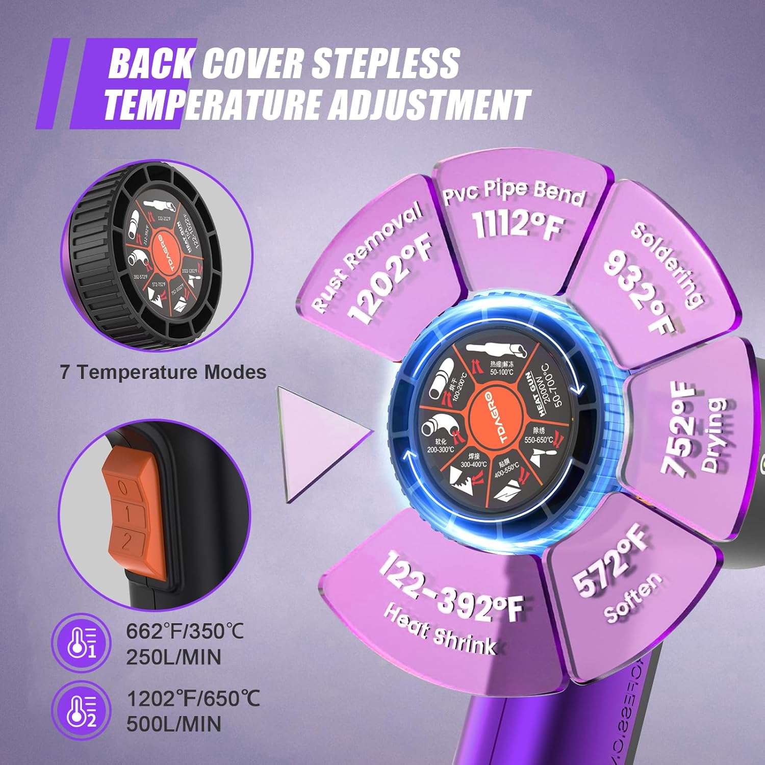 - ✅【Variable Temp Control & 2 Modes】The upgraded heating gun with 7 variable temperature settings and 2 fan settings, allowing users to adjust the temperature from as low as 122℉ to as high as 1202℉, for convenience to deal with their works rightly.