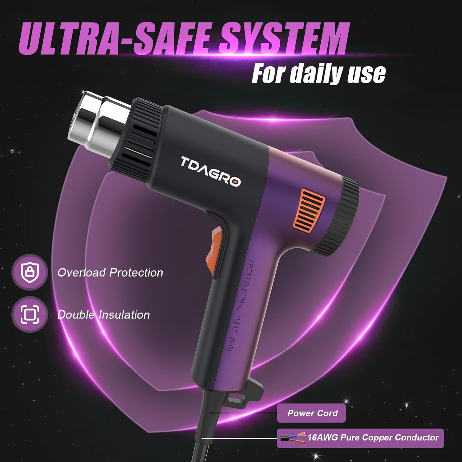 - ✅【Assured quality &Overload Protection 】The heavy duty heat gun builed with high-quality matierial and high-level craftsmanship, adopts a rocket-shaped heating core made of exclusive iron-chromium alloy, it can operate continuously for over 600 hours.For safty it has an overload protector inside, as a cooling system it can shut-off automaticly when overheating to avoid damage to its electronic circuitry, cooperate with flame retardant protective matierials, the cover and handle remain cool during extended use, it can prevent accidental ignition and hurt to user, meanwhile extends the product's service life.