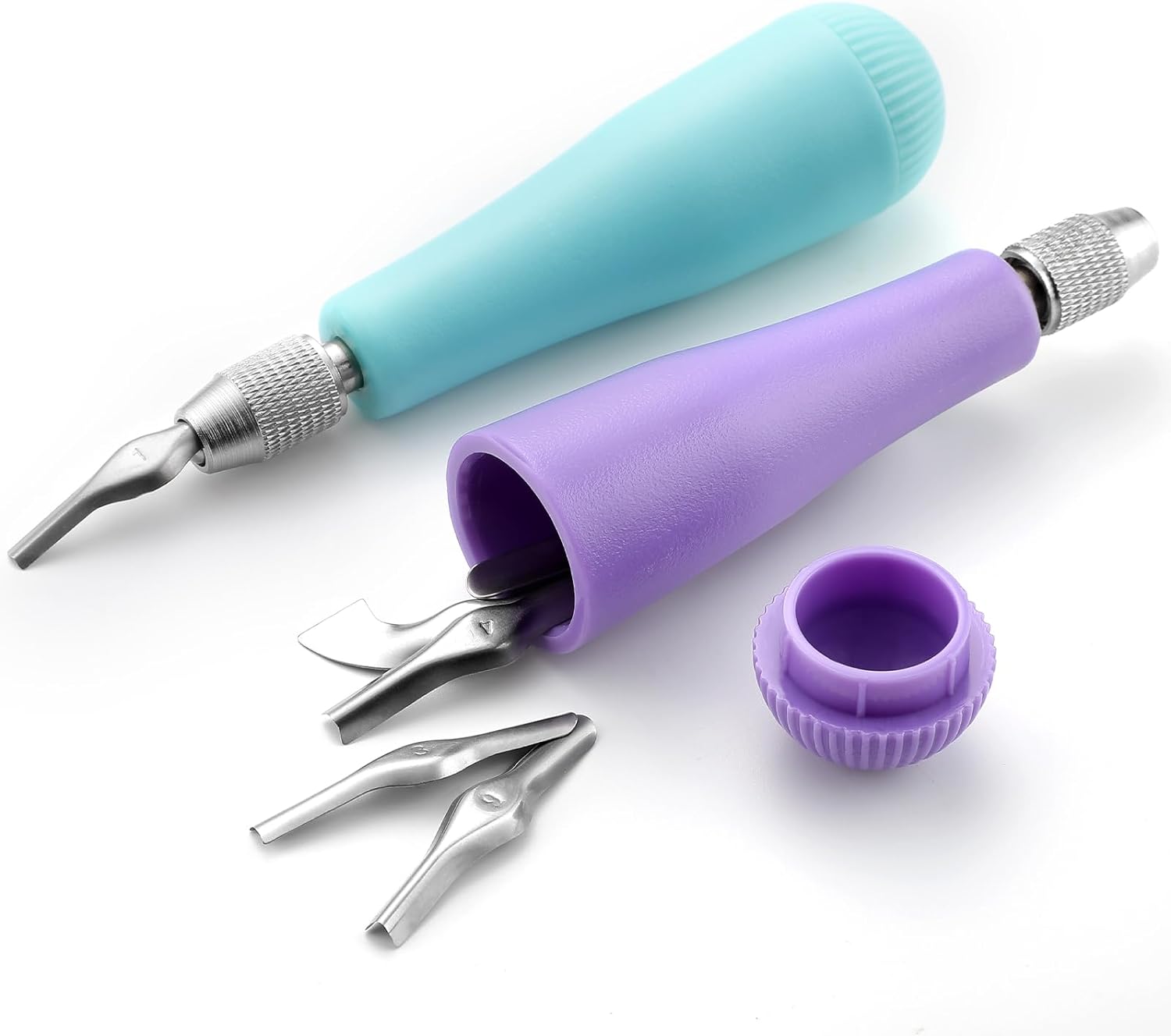 - Linoleum carving tools: each set of our engraving tools comes with 6 types of cutting blades: small, medium and large size V-shaped knife, U-shaped knife, round knife and flat knife to easily achieve a variety of engraving effects. When changing the blade, you need to unscrew the top chuck first, then put the blade into the slot, replace the top and tighten it