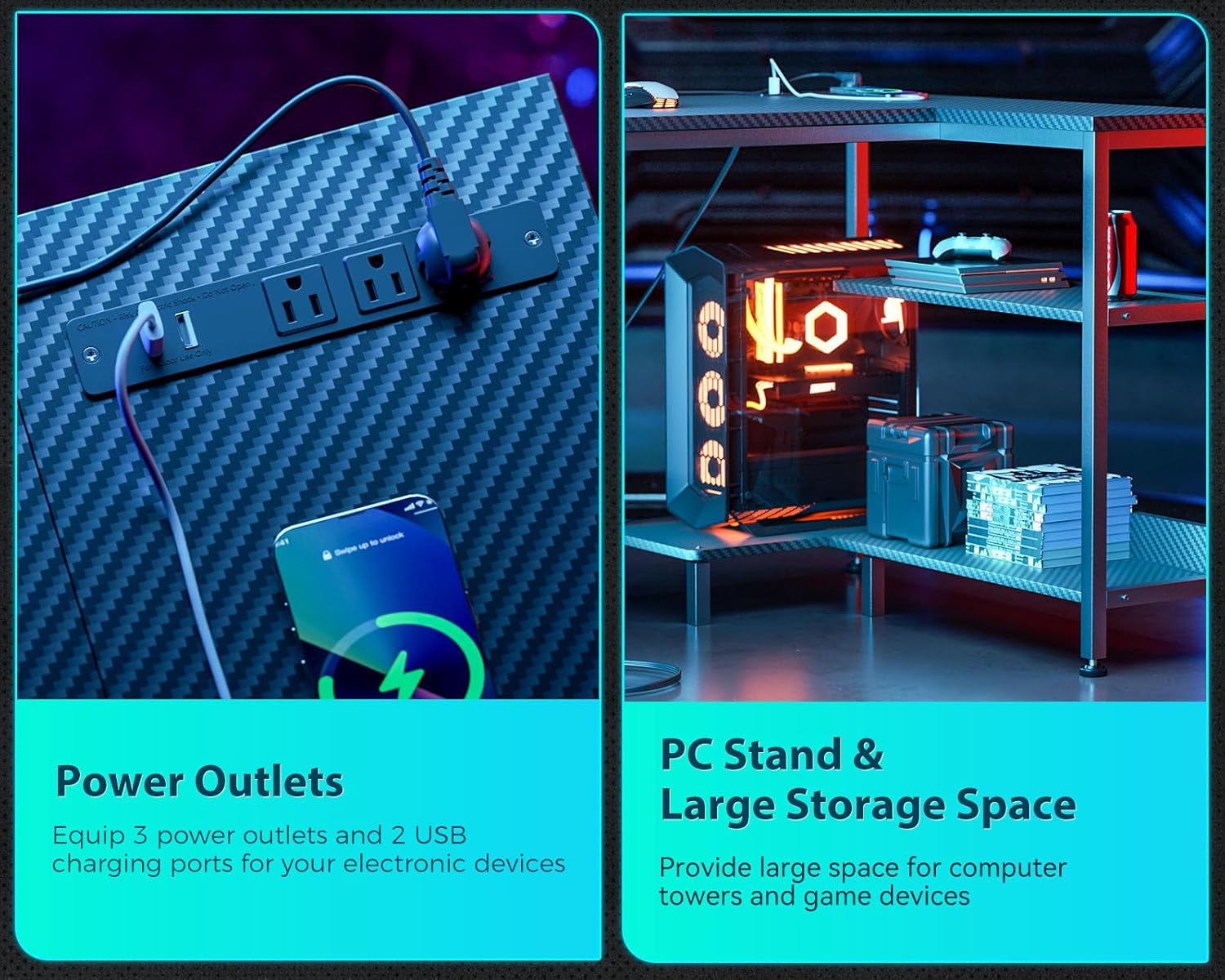 ODK 55 Inch L Shaped Gaming Computer Desk with Power Outlets, Corner Desk with Reversible Storage Shelves & PC Stand for Small Space, Modern Simple Home Office Table, Carbon Fiber Surface, Black