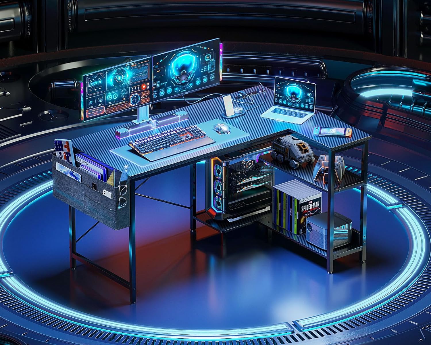 ODK 48 Inch Small L Shaped Gaming Computer Desk with Power Outlets, Corner Desk with Reversible Storage Shelves & PC Stand for Small Space, Modern Simple Home Office Table, Carbon Fiber Surface, Black