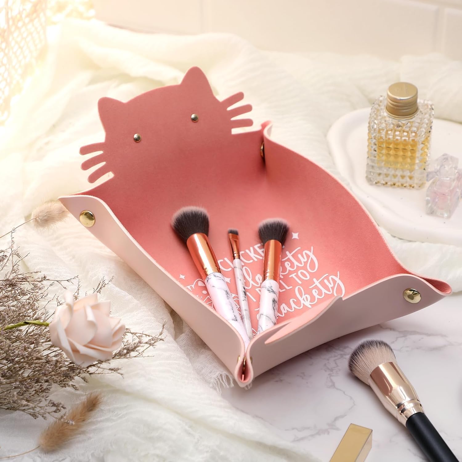 - Perfect Cat Dice Tray. Package includes 1-pack pinkk cat-shaped PU leather tray which is printed with a cute cat and funny words. Nice gift idea for the role-playing games players especially for girls!