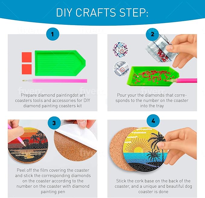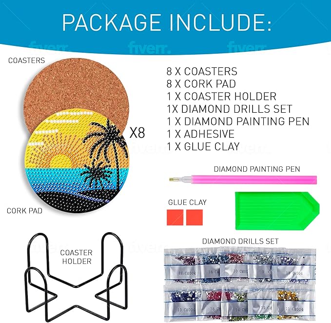 - Easy Installation: This diamond painting kits come with diamond painting tools that allow you to complete 8 coasters. Simply peel off the protective film on the coaster, locate the corresponding fake diamond based on the numbers/letters on the coaster (marked on the bags), and start crafting. Finally, attach the button pad to the back of the coaster.