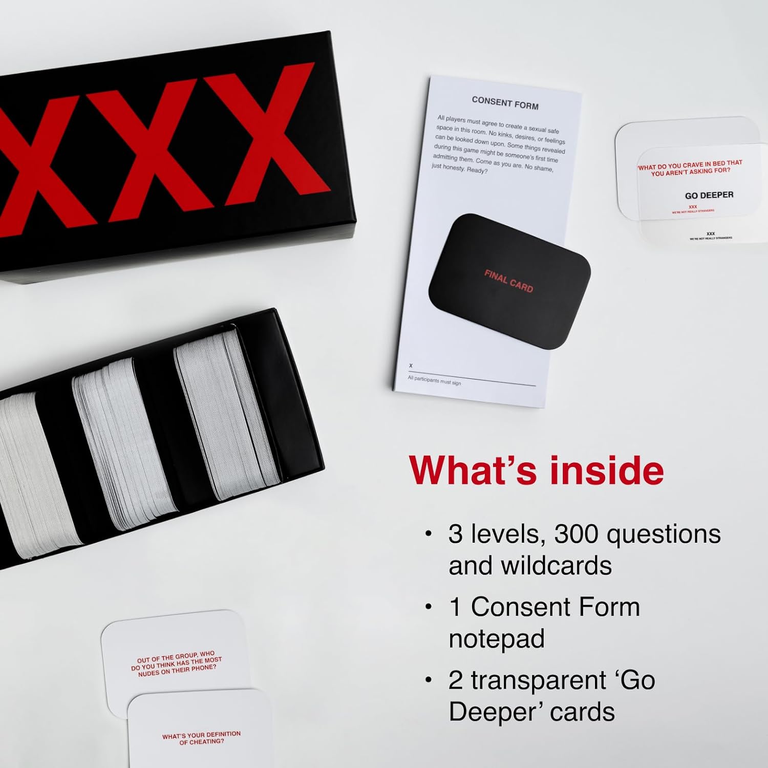 - WHAT’S INSIDE - 300 conversation cards and wildcards, 1 Consent Form Notepad, 1 Final Card, and 2 Transparent “Go Deeper” cards, which encourage players to open up even more and strengthen their friendships. 2-6 players, ages 18+. Warning: explicit content.