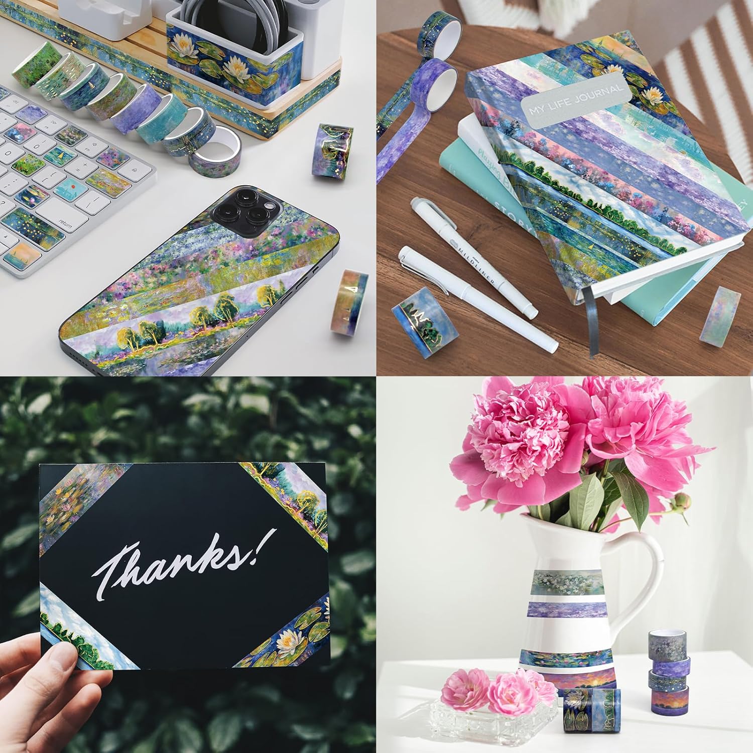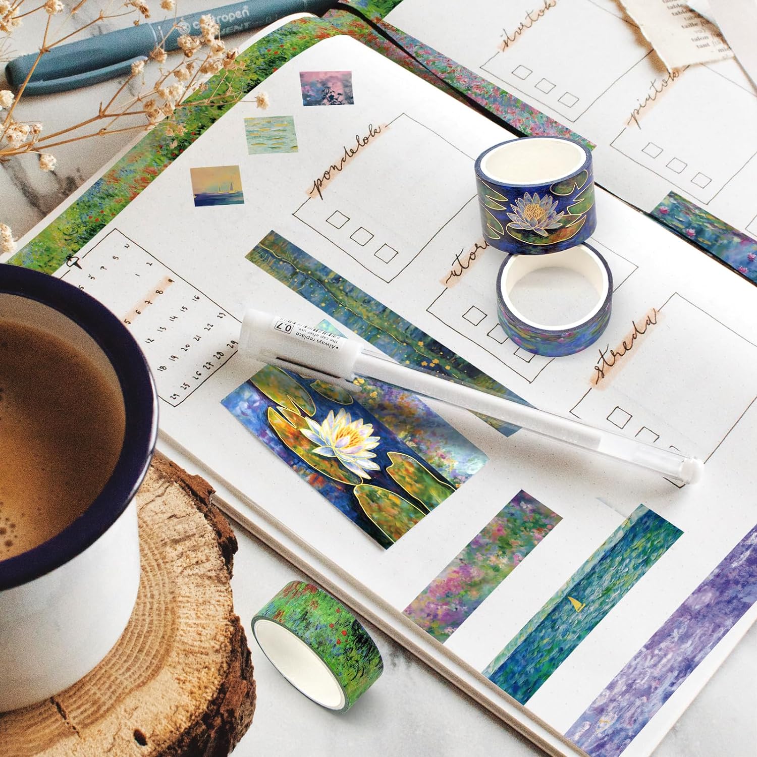 - [Beautiful Design] - 27 rolls of washi tape set, each roll is an exclusive design by the designer. The decorative tapes are designed with different Monet oil painting patterns into unique style tapes, breaking your traditional impression of washi tapes. The washi tape patterns are colorful, each roll is colorful, dreamy and unique!
